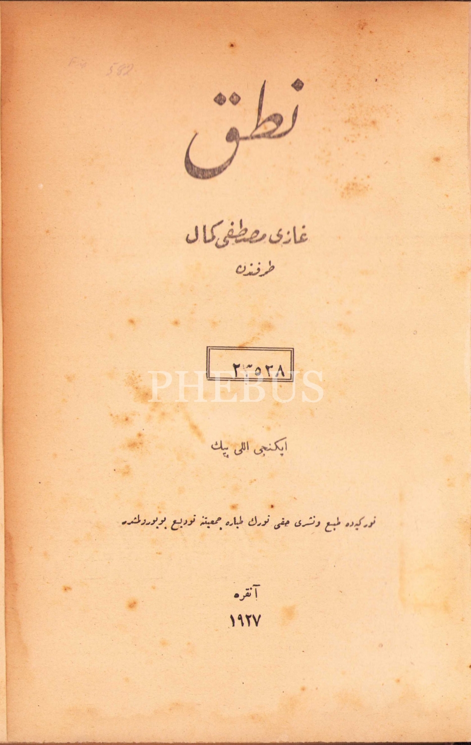 Osmanlıca Nutuk, Gazi Mustafa Kemal [Atatürk], İkinci Elli Bin, Ankara 1927, haritaları mevcut değil, 543 sayfa, 19x28 cm, ÖZEGE; 15583