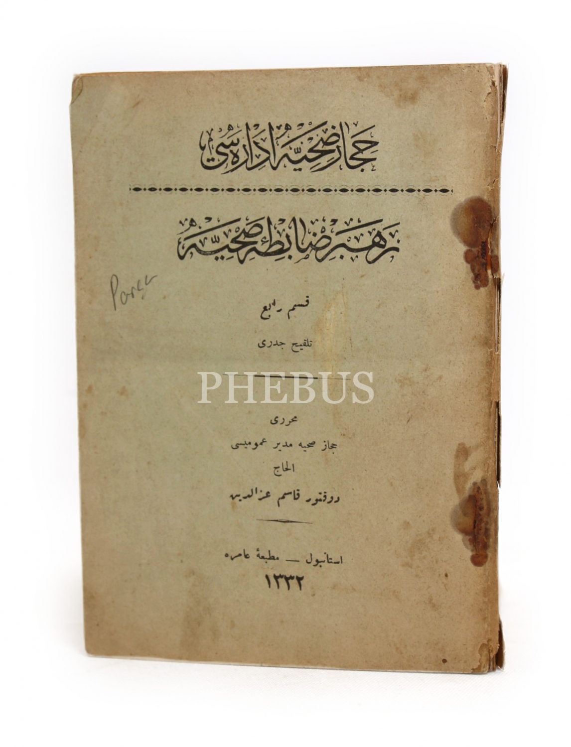 Osmanlıca Rehber-i Zabıta-i Sıhhiye Emraz-i Sâriye ve Müstevliye 4. Kısım, Kasım İzzetdin, 1332 Matbaa-i Âmire, 284 sayfa, ÖZEGE; 16677, 16x12 cm