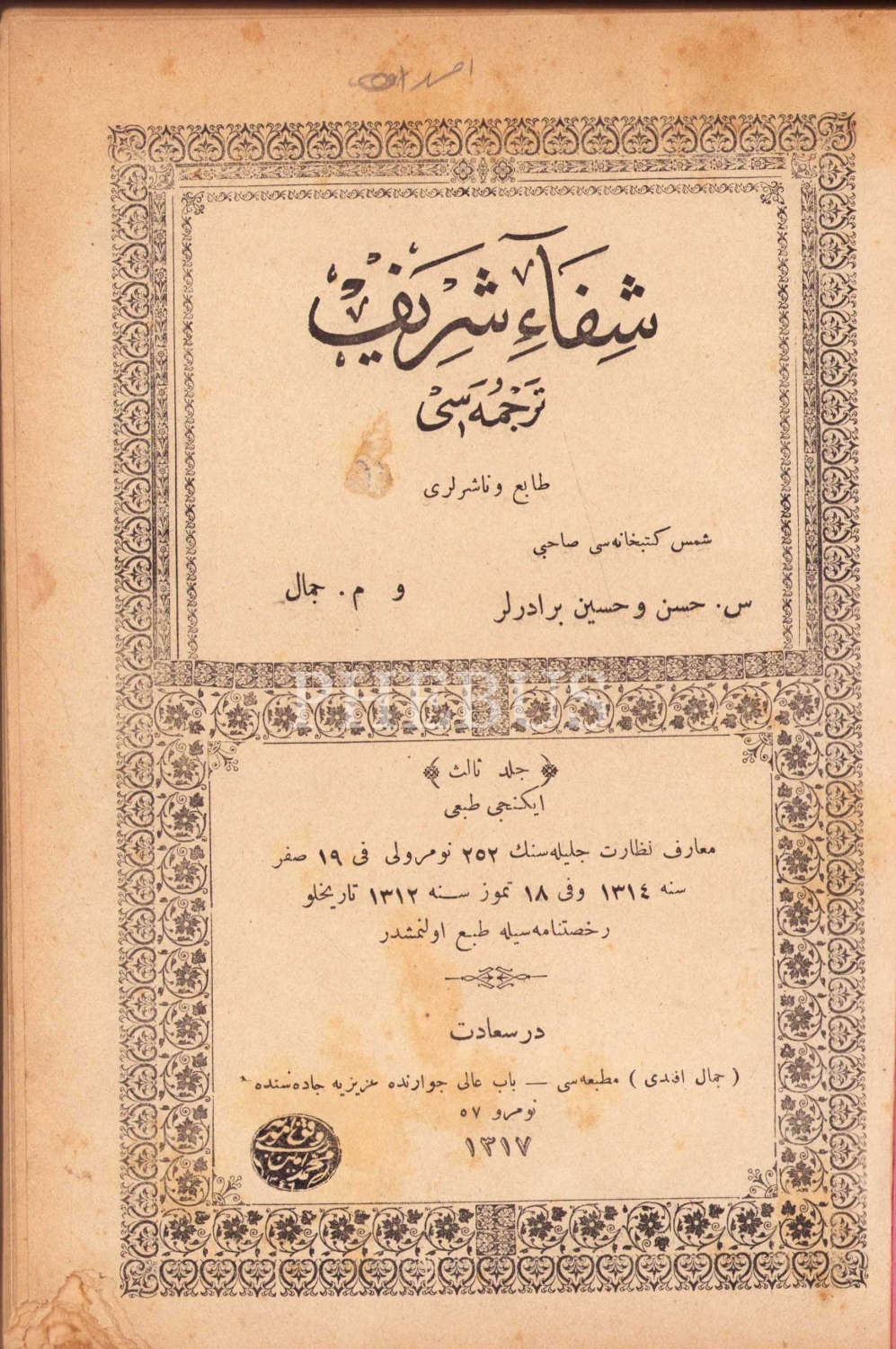 Osmanlıca Şifâ-i Şerîf Tercümesi 3. Cilt, Kadı Ebülfazl İyaz b. Musa, Çeviren İbrahim Hanif, İstanbul 1314, Matbaa: Cemal Efendi Matbaası, 964-1426 sayfa ÖZEGE; 18948, 24x17 cm