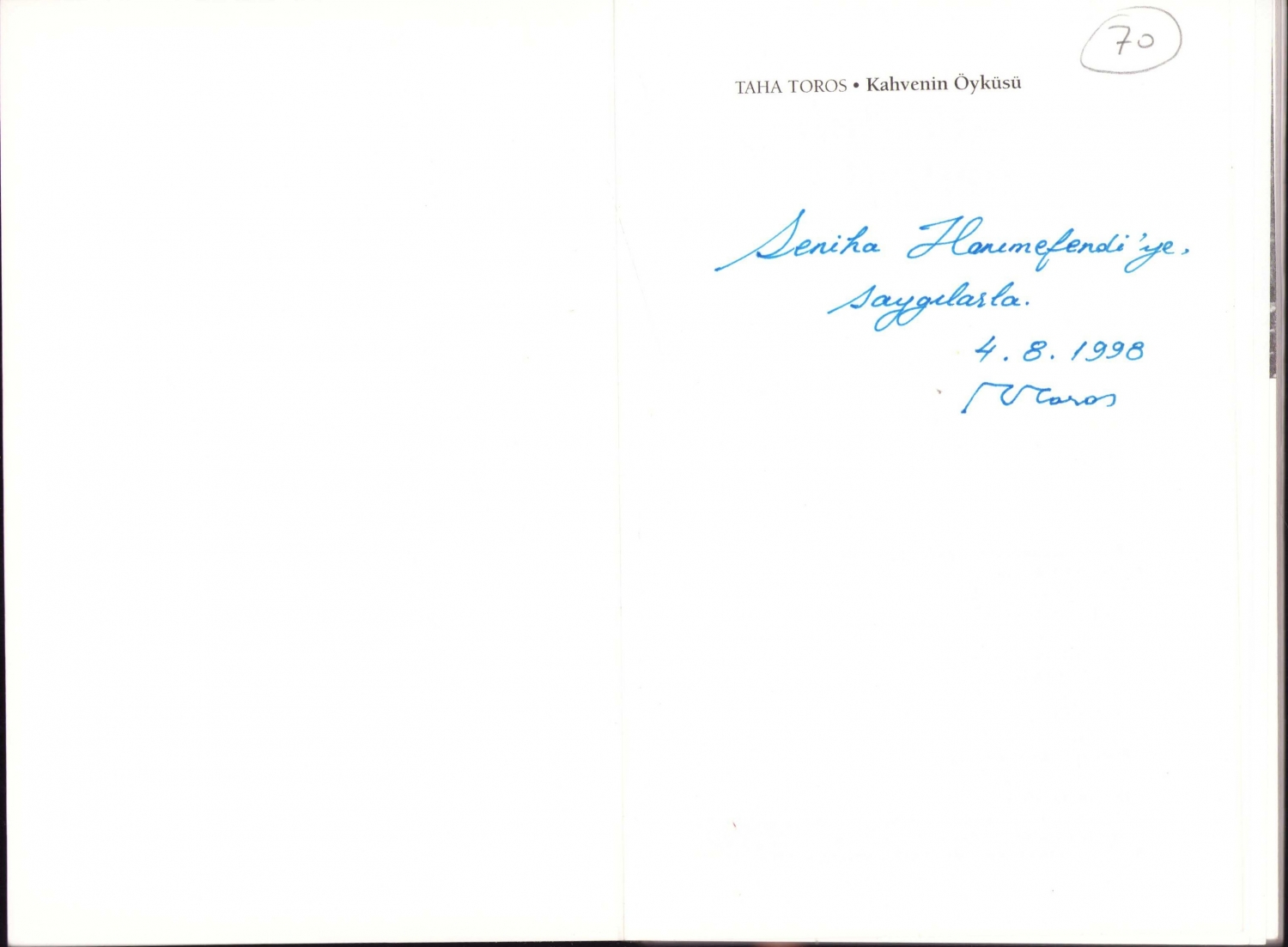 Kahvenin Öyküsü, Taha Toros'tan imzalı ve ithaflı, 1998, 87 sayfa
