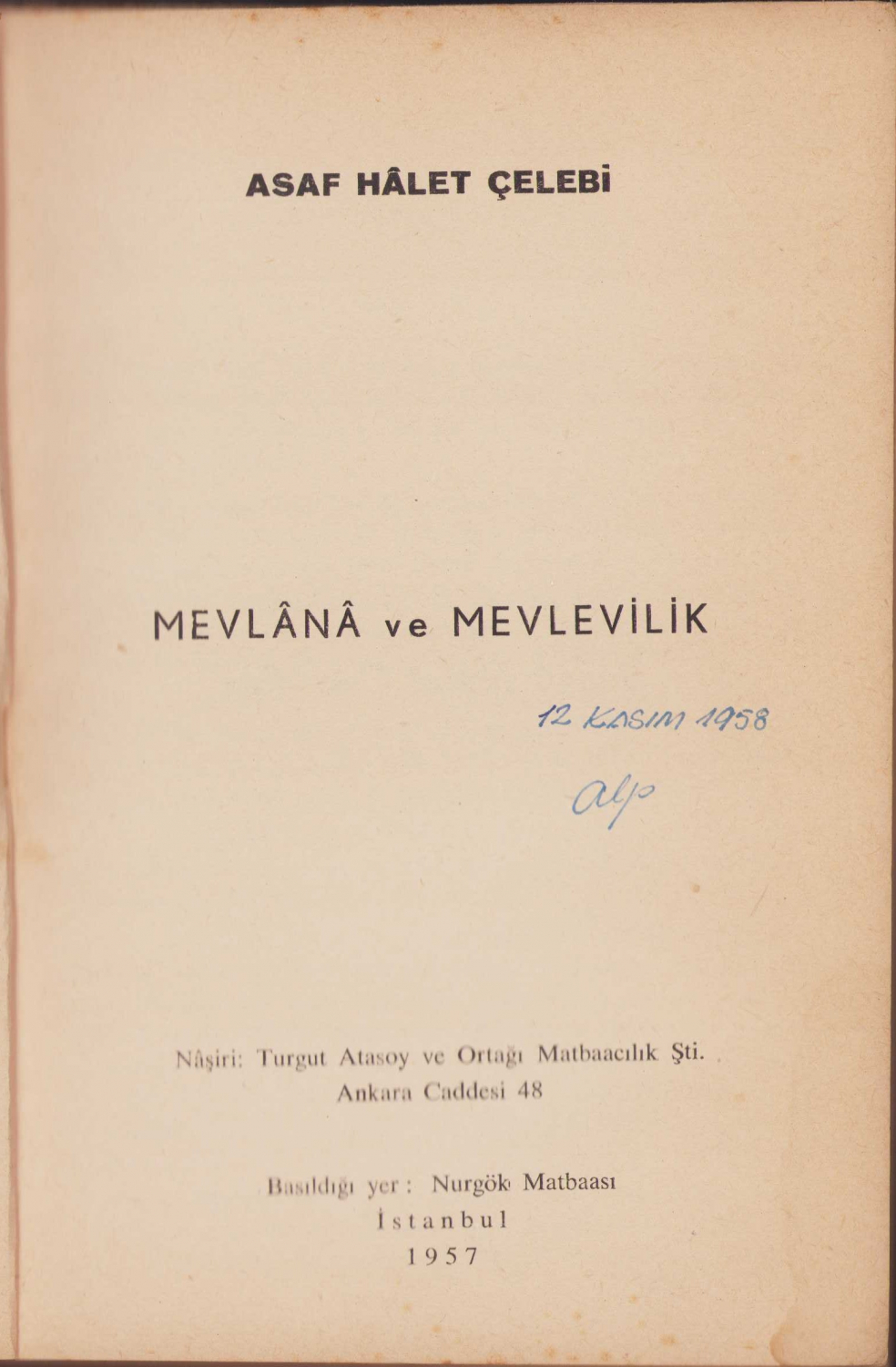 Mevlana ve Mevlevilik, Asaf Halet Çelebi, Nurgök Matbaası, İstanbul, 1957, imzalı, 208 sayfa, 14x20cm