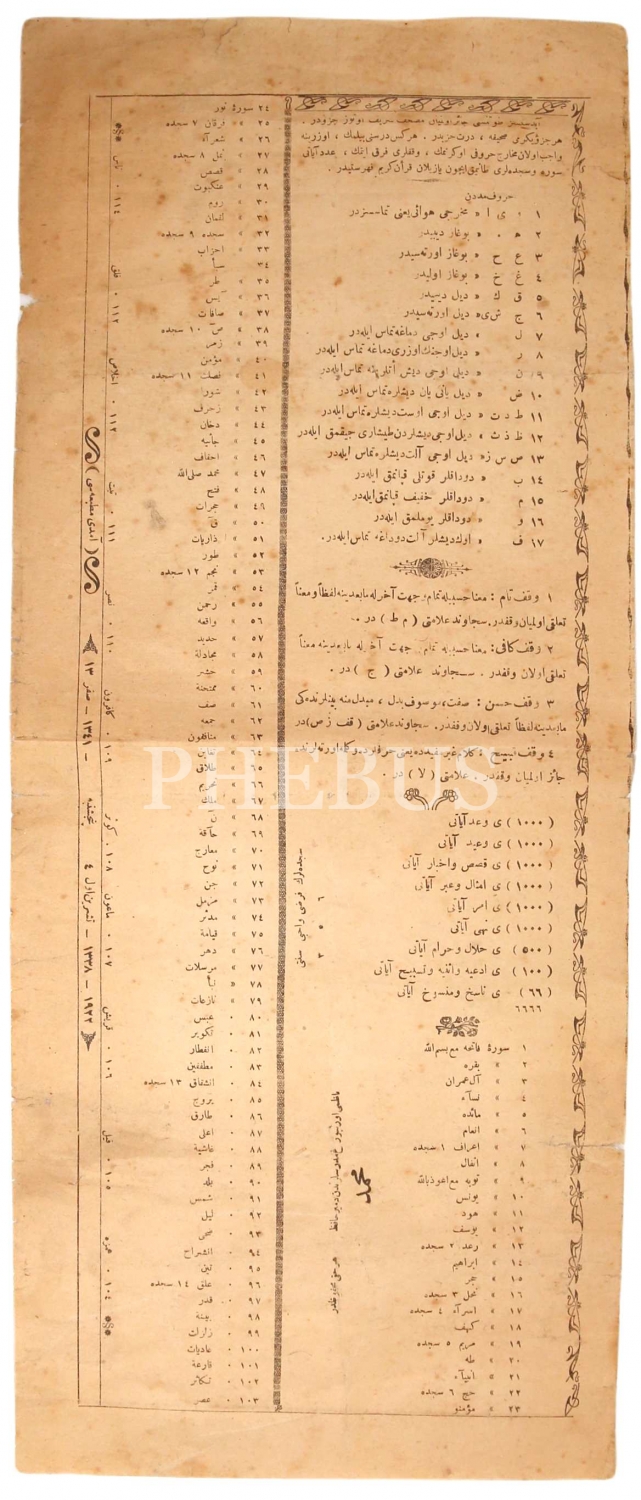 Nazımi Medreselerinden Demşz Hafız Mehmed tarafından basılan Musaf-ı Şerif fihristi, 19x46 cm