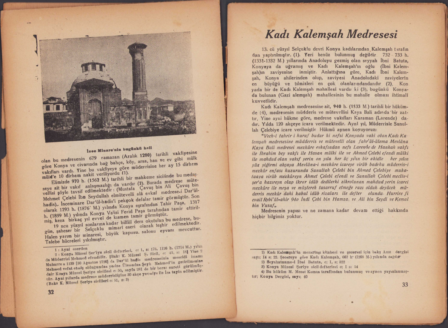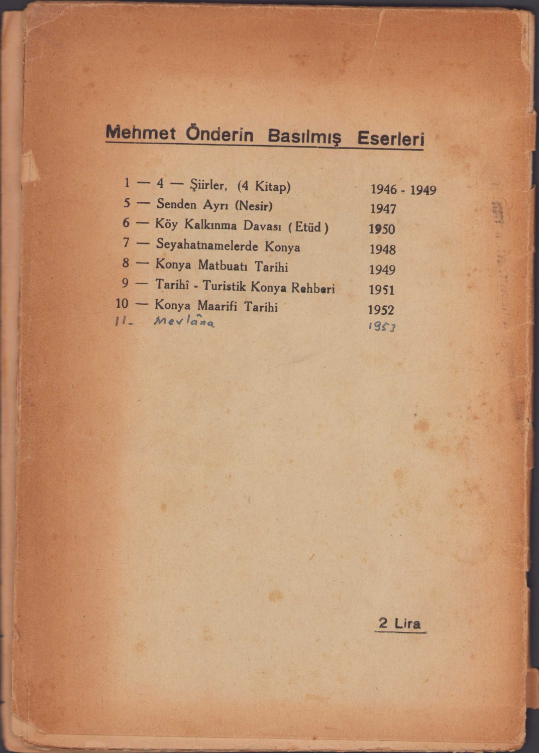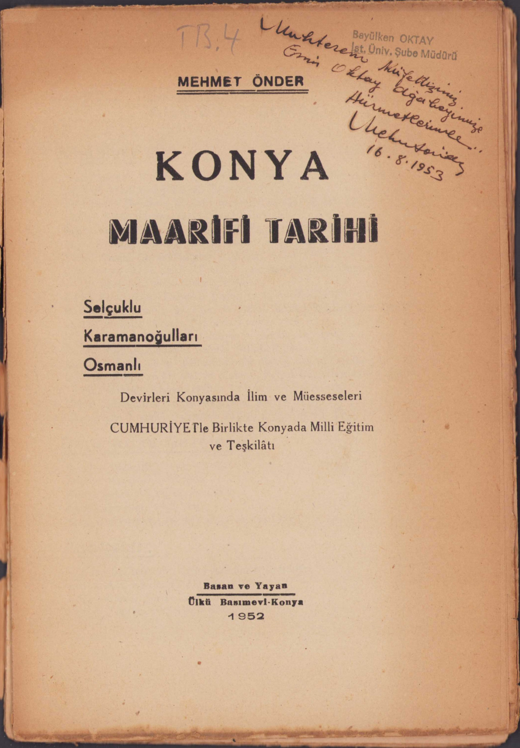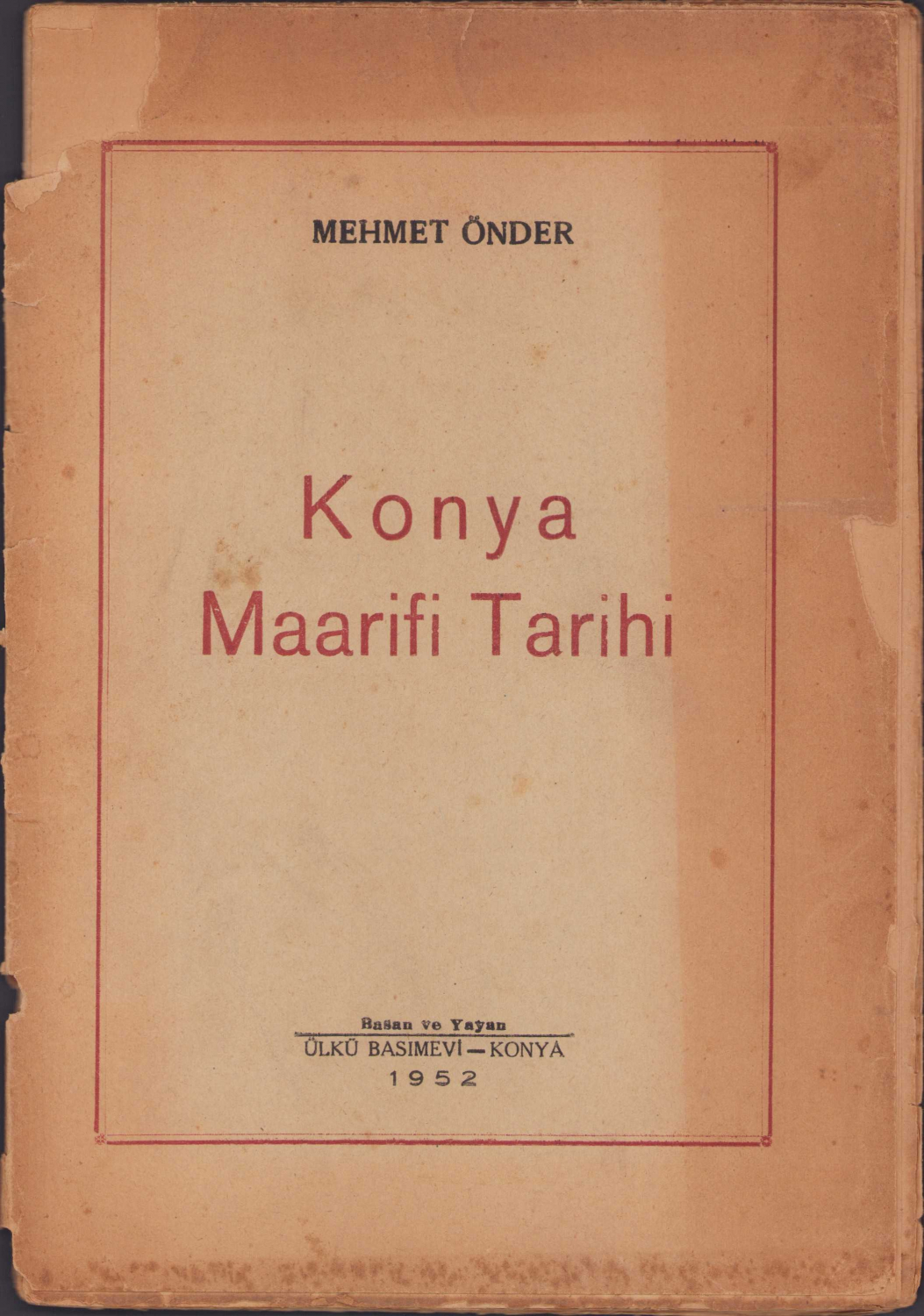 Konya Maarifi Tarihi, yazarı Mehmet Önder'den imzalı, Ülkü Basımevi, Konya, 1952, ön kapak bir kenarı kopuk, 93 sayfa, 17x25cm