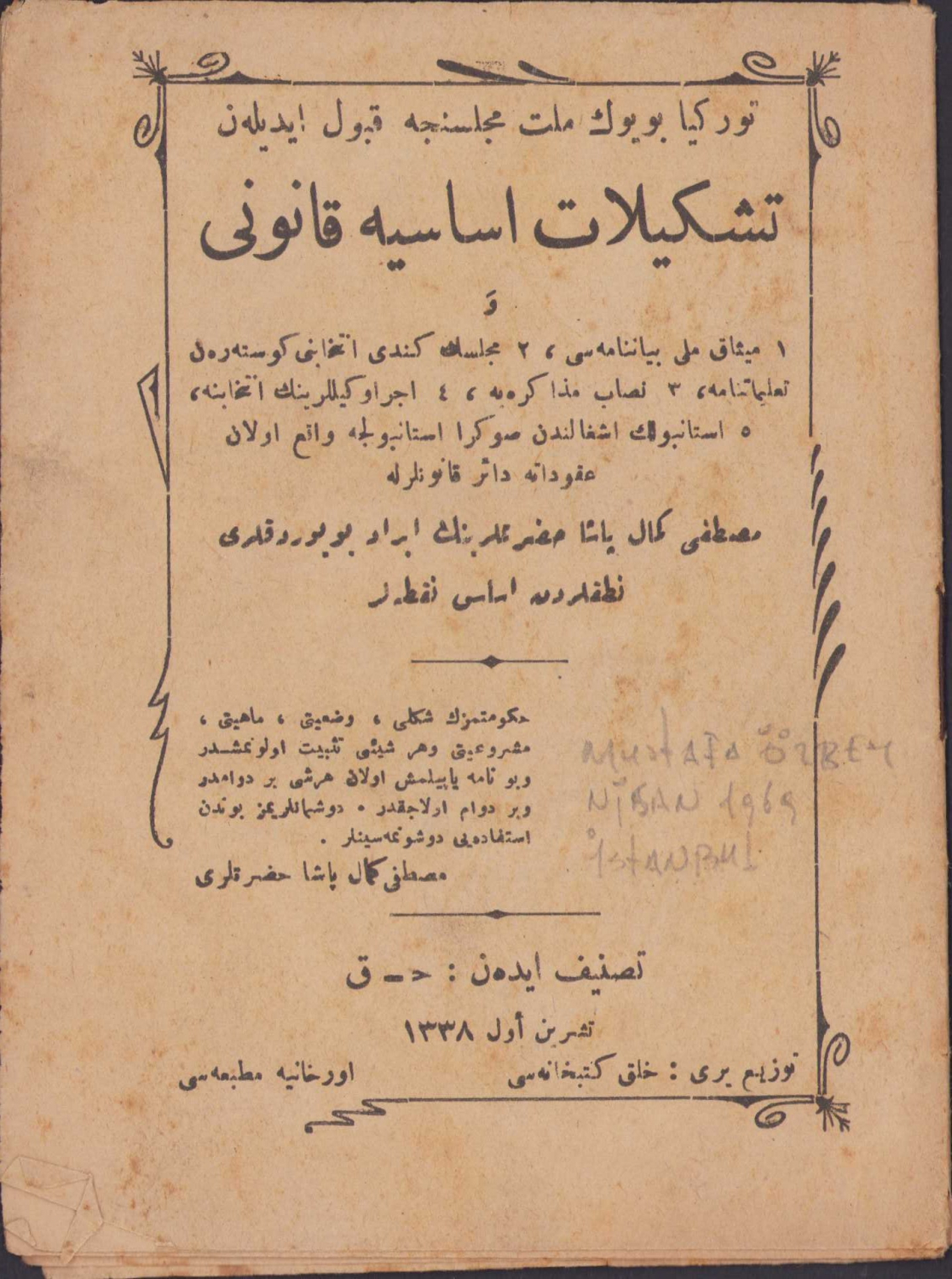 Türkiye Büyük Millet Meclisince Kabul Edilen Teşkilatı Esasiye Kanunu, Orhaniye Matbaası, Halk Kütüphanesi, 1338, Osmanlıca, kapakta Mustafa Kemal'in sözü yer almakta, 29 sayfa, 12x16cm