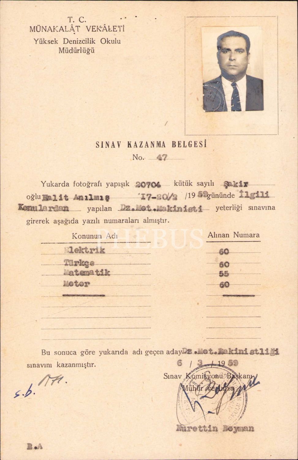 Münakalat Vekaleti Yüksek Denizcilik Okulu Müdürlüğü sınav kazanma belgesi, 1959 tarihli, 12x22 cm