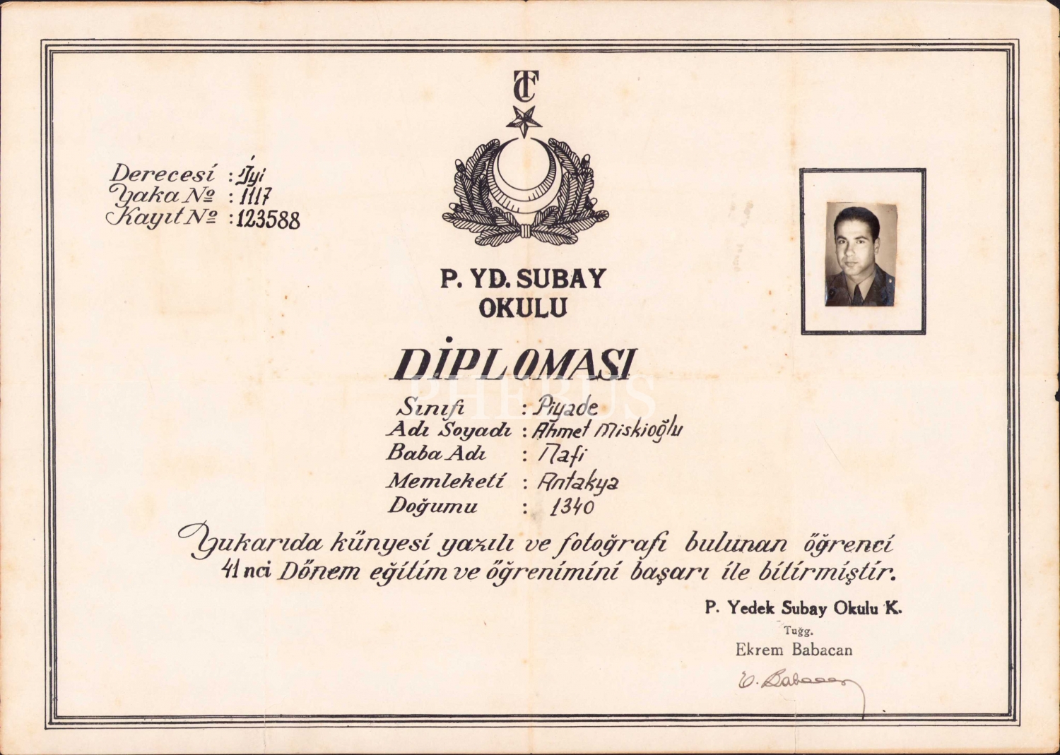 Piyade Yd. Subay Okulu diploması, 35x24 cm