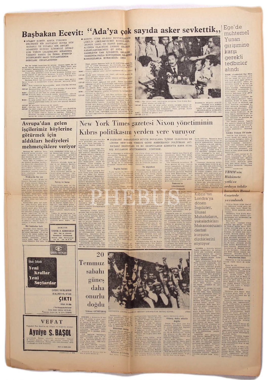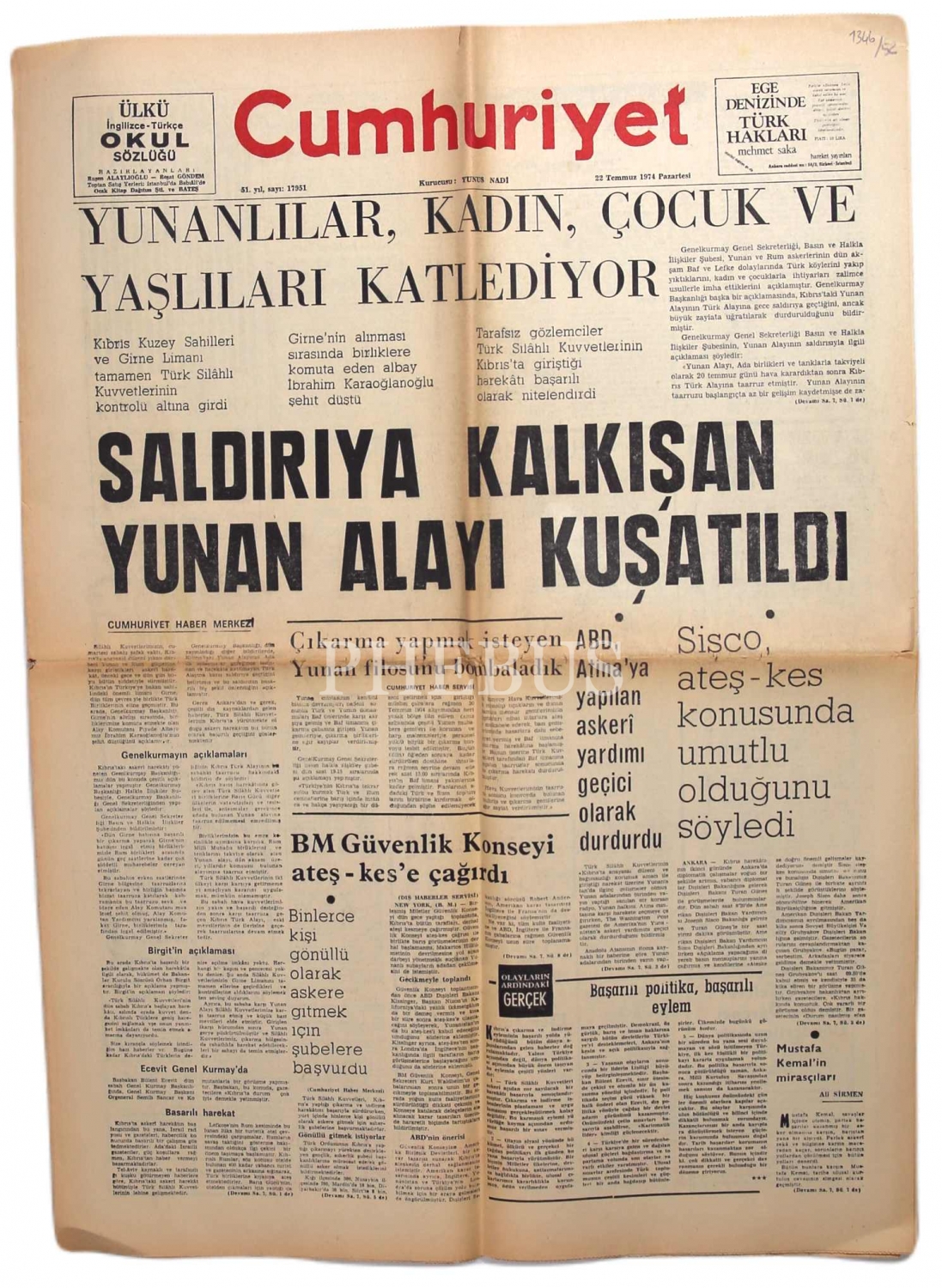 Saldırıya Kalkışan Yunan Alayı Kuşatıldı manşetli, Cumhuriyet gazetesi, 22 Temmuz 1974, 8 sayfa, 42x60 cm