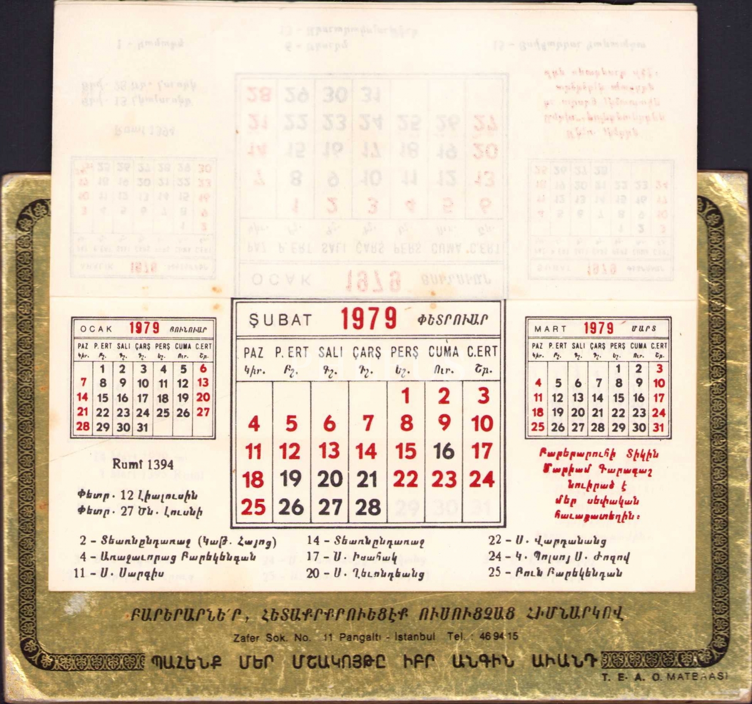 T.E.A.O Öğretmenleri Yardımlaşma Vakfı tarafından çıkarılan Türkçe - Ermenice 1979 takvimi, 16x11 cm