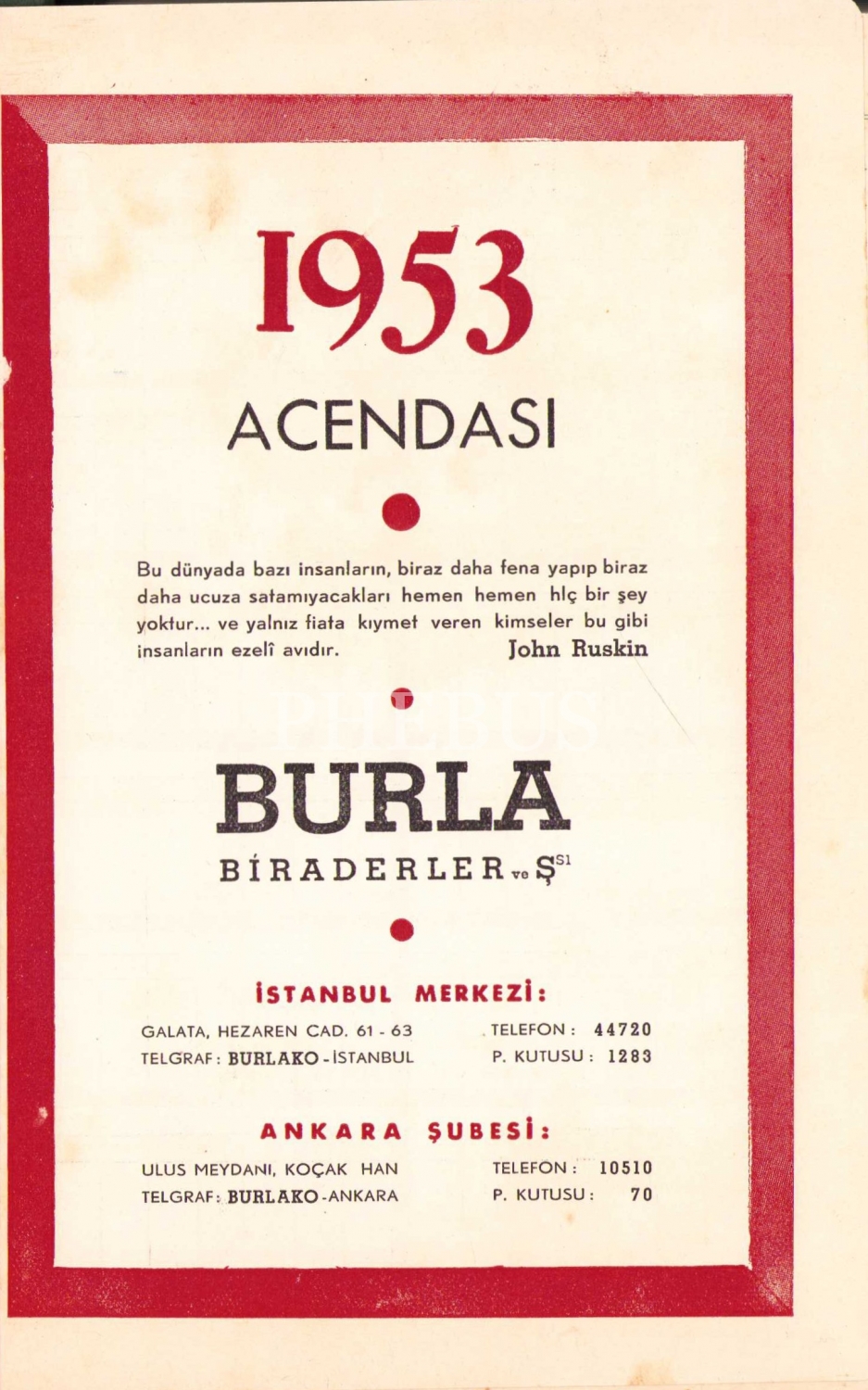 Burla Biraderler AŞ. 1953 yılı ajanda, 14x20 cm