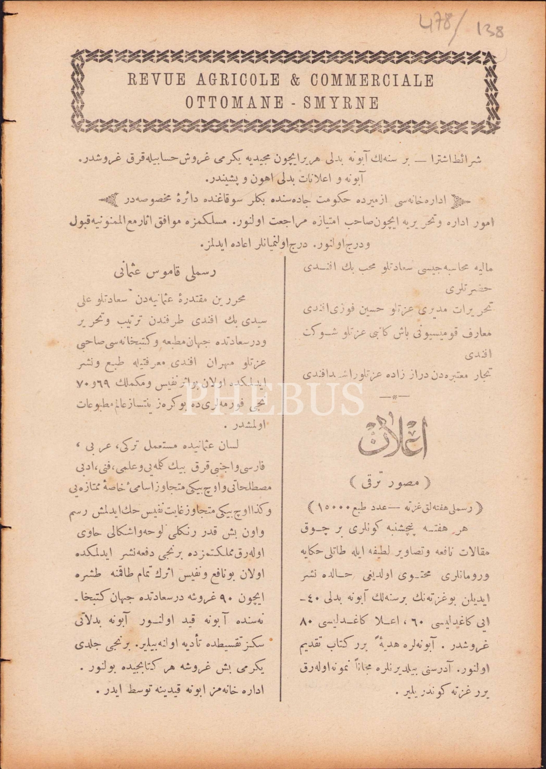 Osmanlı Ziraat ve Ticareti, başyazarı Salih Zeki, İzmir Keşişyan Matbaası, 1325, 20 sayfa, 18x24 cm