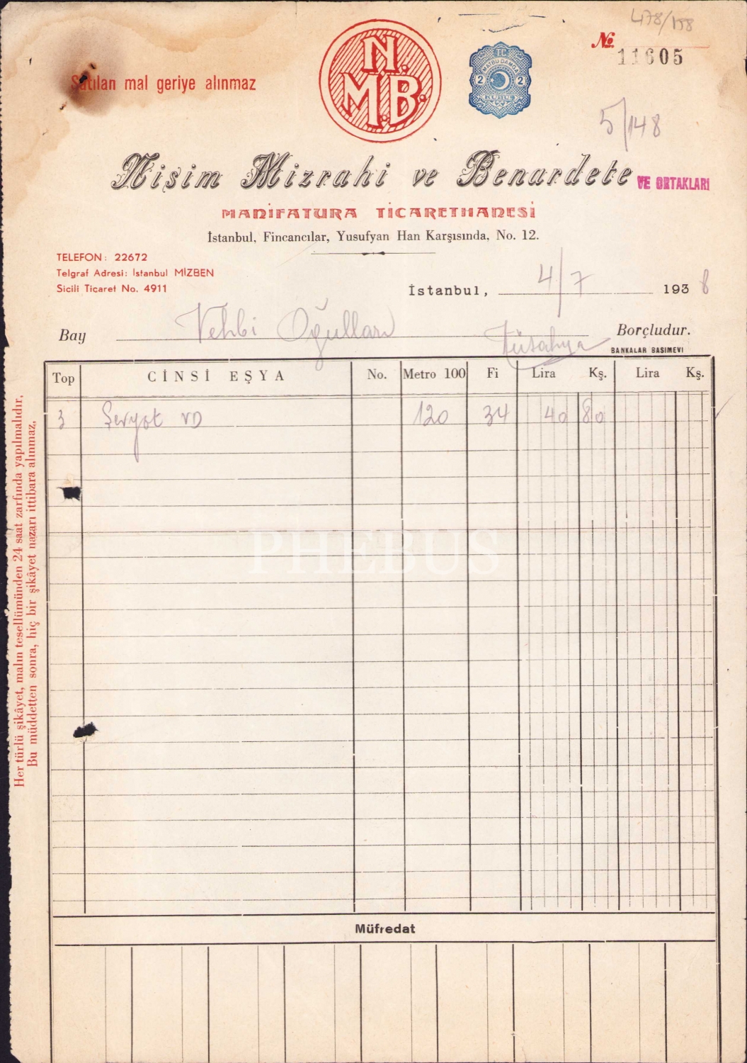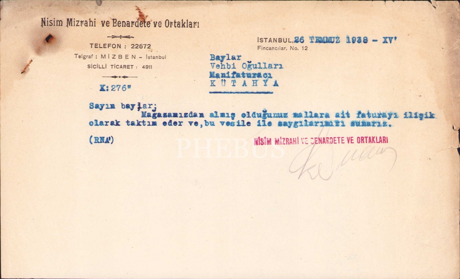 Nizim Mizrahi ve Benardete Manifatura Ticarethanesi antetli fatura, 1938, bir kenar haliyle, 20x30 cm