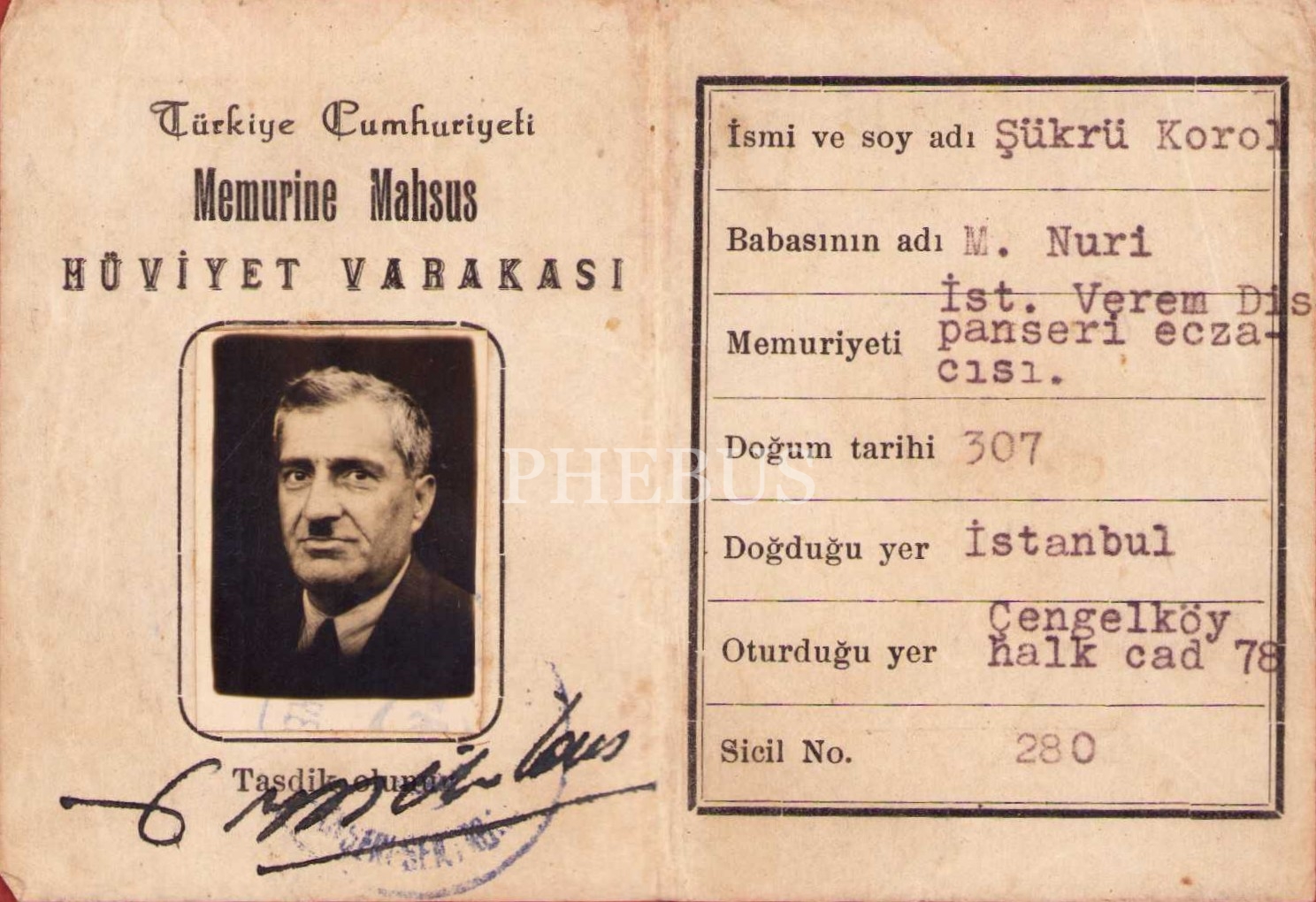 TC. Memura mahsus hüviyet varakası, Şükrü Korol, 6x9 cm