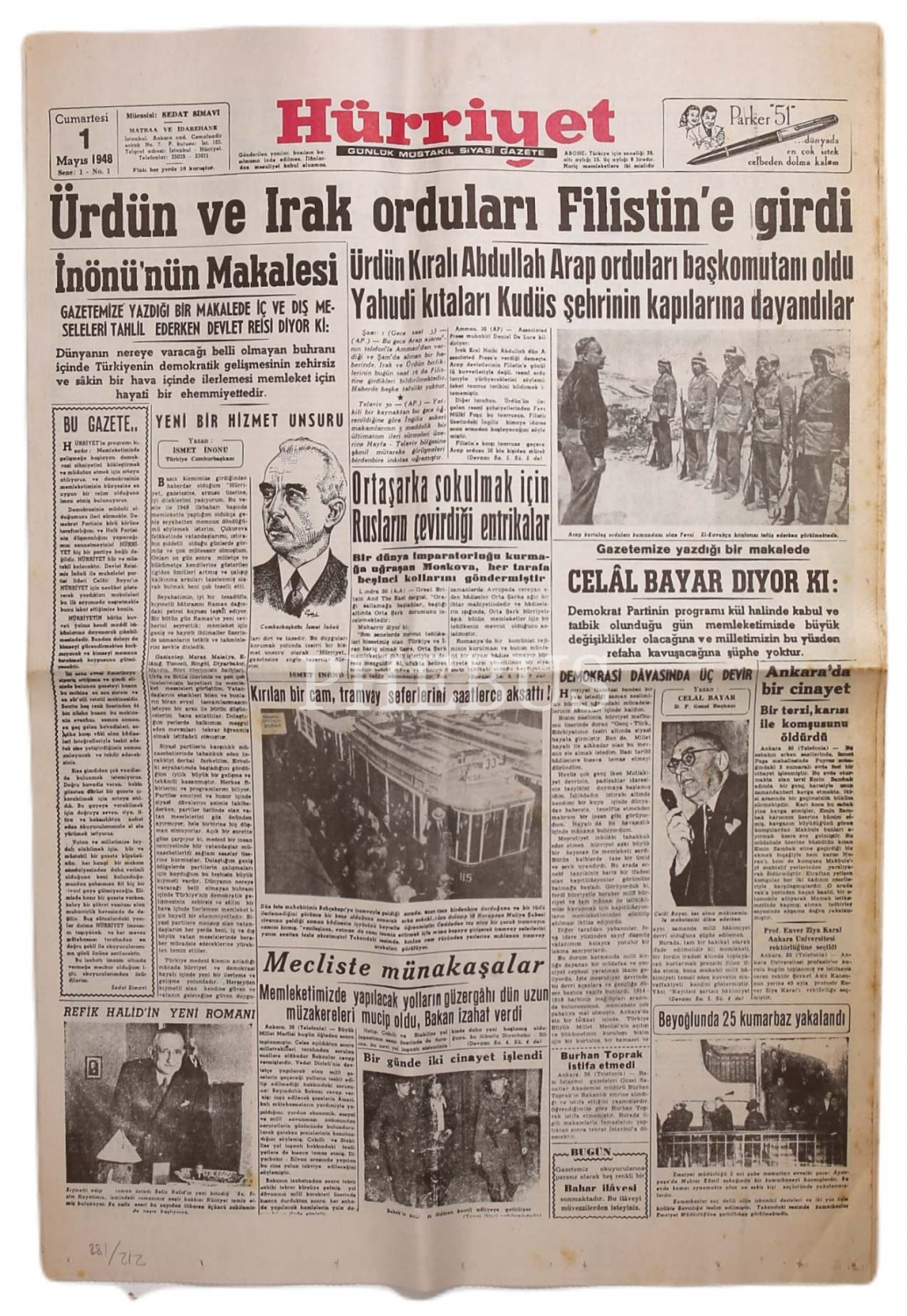 Ürdün ve Irak Orduları Filistin'e Girdi manşetli, Hürriyet gazetesi, 1 Mayıs 1948, 6 sayfa, 37x54 cm