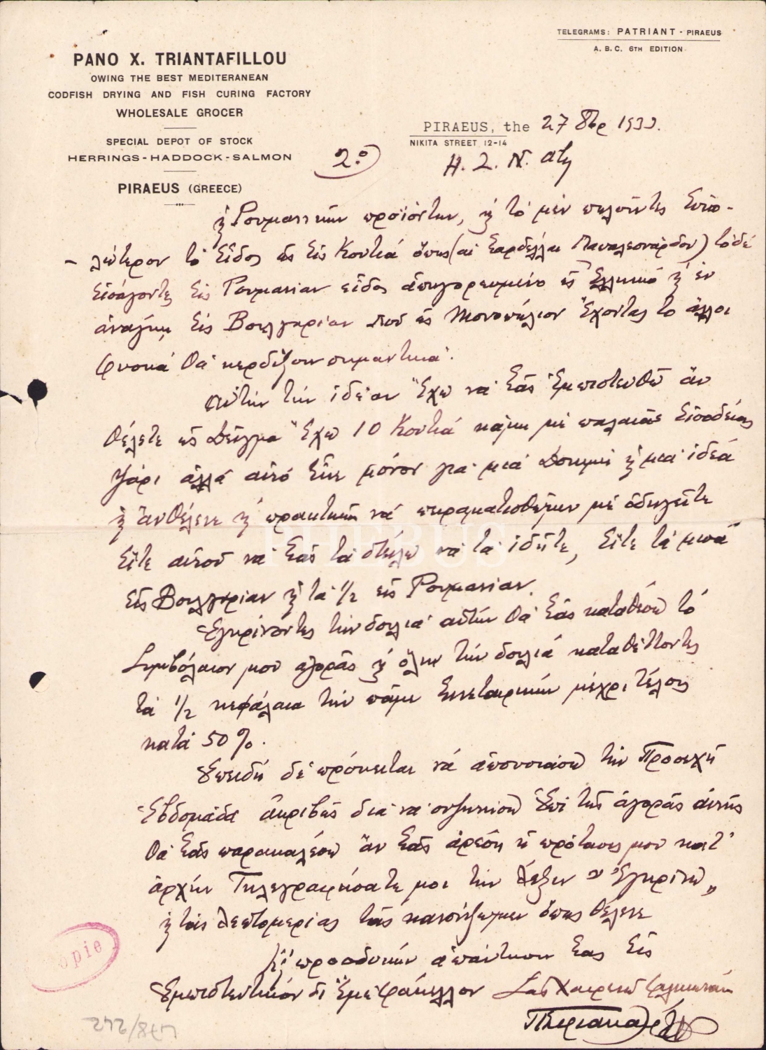 Pano X. Triantafillou antetli 1933 tarihli doküman, 20x28cm