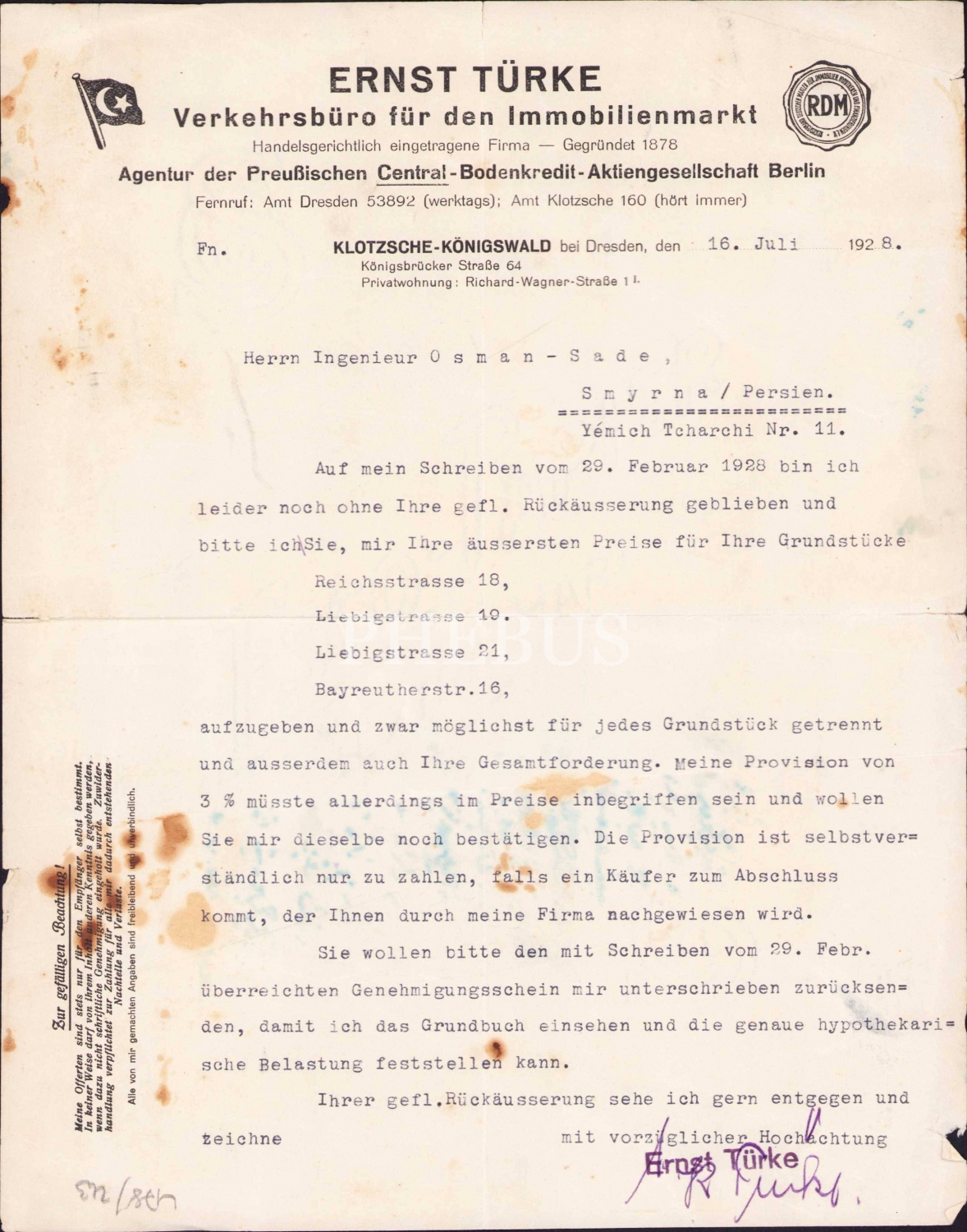 Ernst Türke antetli Almanca doküman, 1928, kenarları haliyle, 21x28 cm