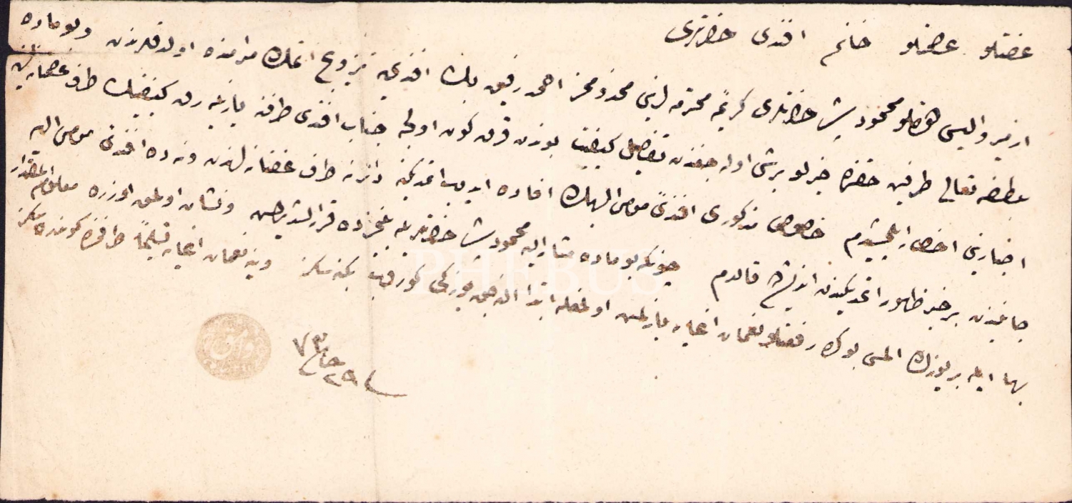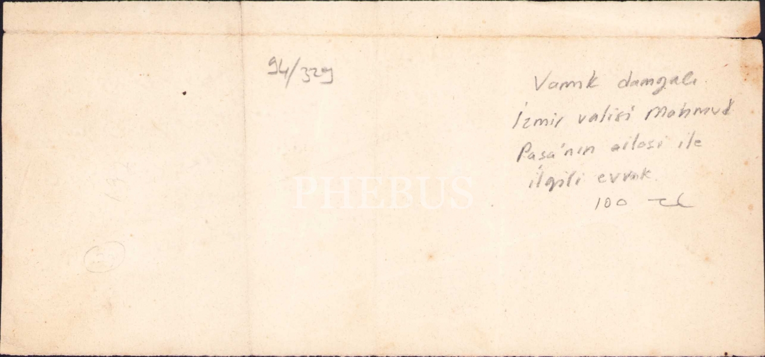 Vamık damgalı, İzmir valisi Mahmud Paşa'nın ailesi ile ilgili Osmanlıca evrak, 1273, 20x9 cm