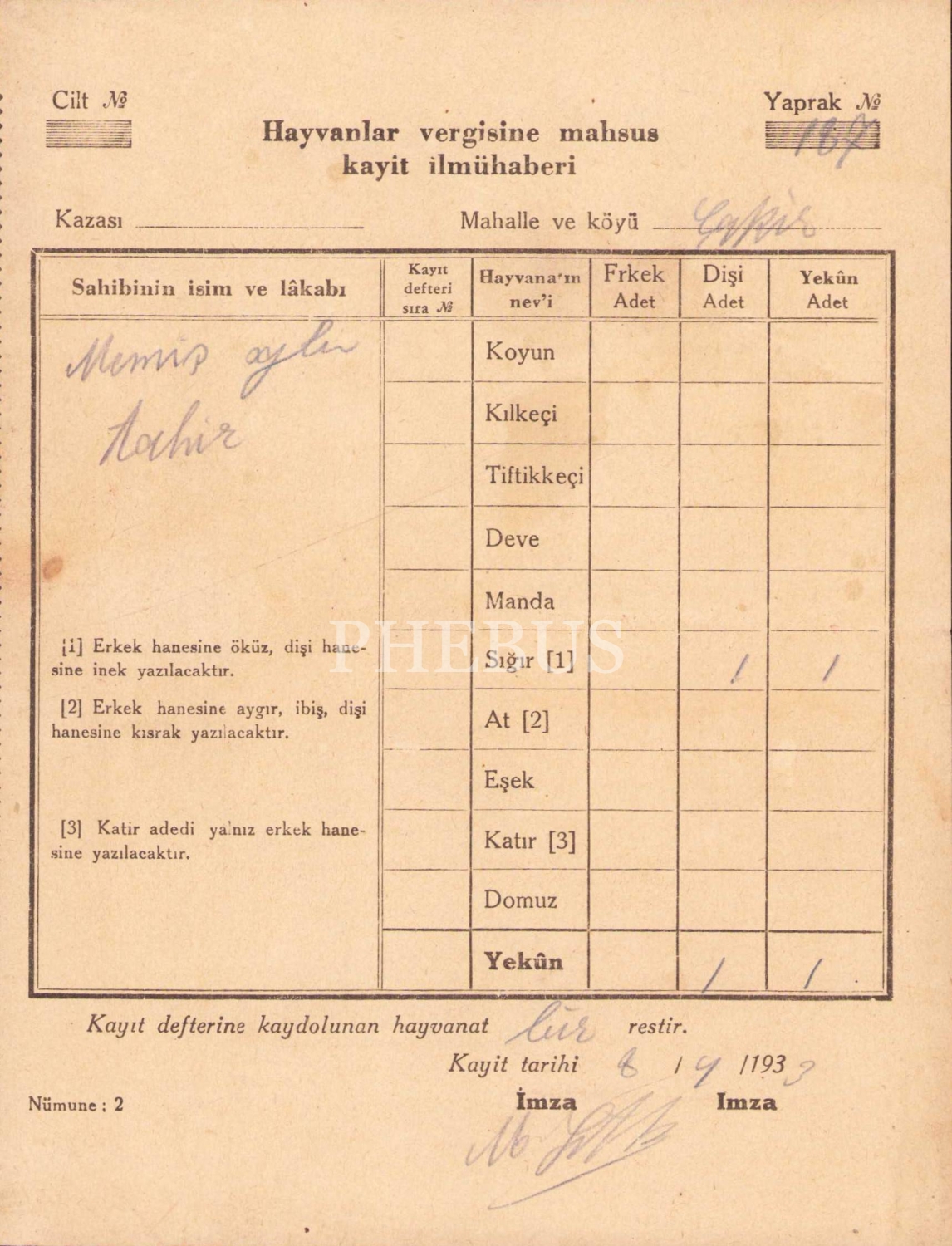 Hayvanlar verigisine mahsus kayıt ilmühaberi, 1933, 14x18 cm