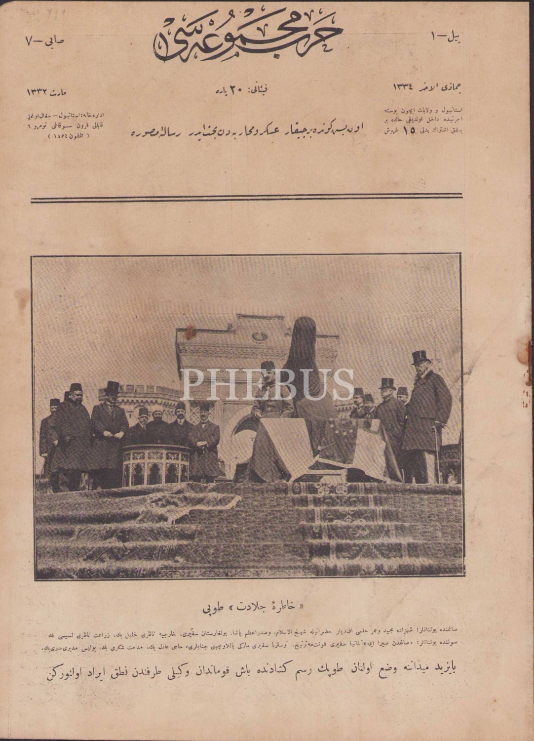 Osmanlıca Harp Mecmuası, Sayı 7, 1332, kapak " Beyazıd Meydanında Hatıra-i Celadet Topu Açılışında Baş Kumandan Vekili Enver Paşa Nutuk İrad Olunurken", 16 sayfa, 22x30 cm