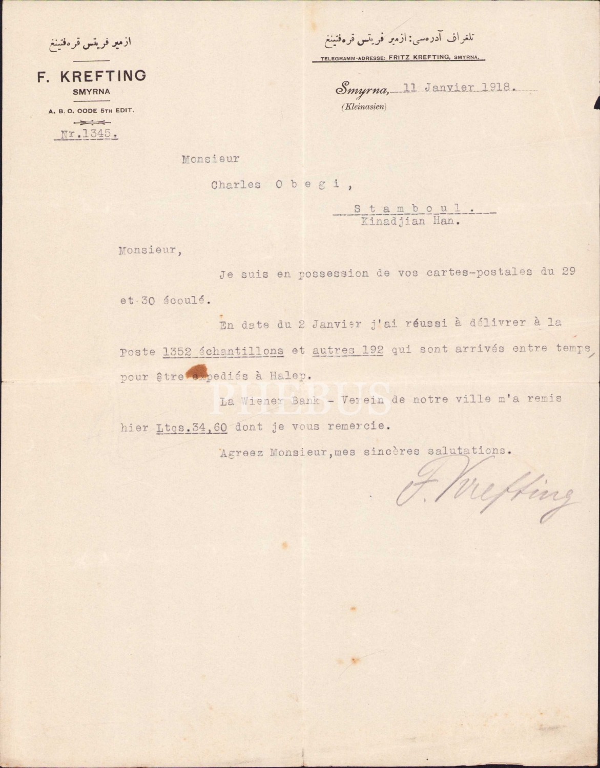 Osmanlıca Fransızca İzmir F. Krefting antetli, 1918 tarihli doküman, 21x28 cm