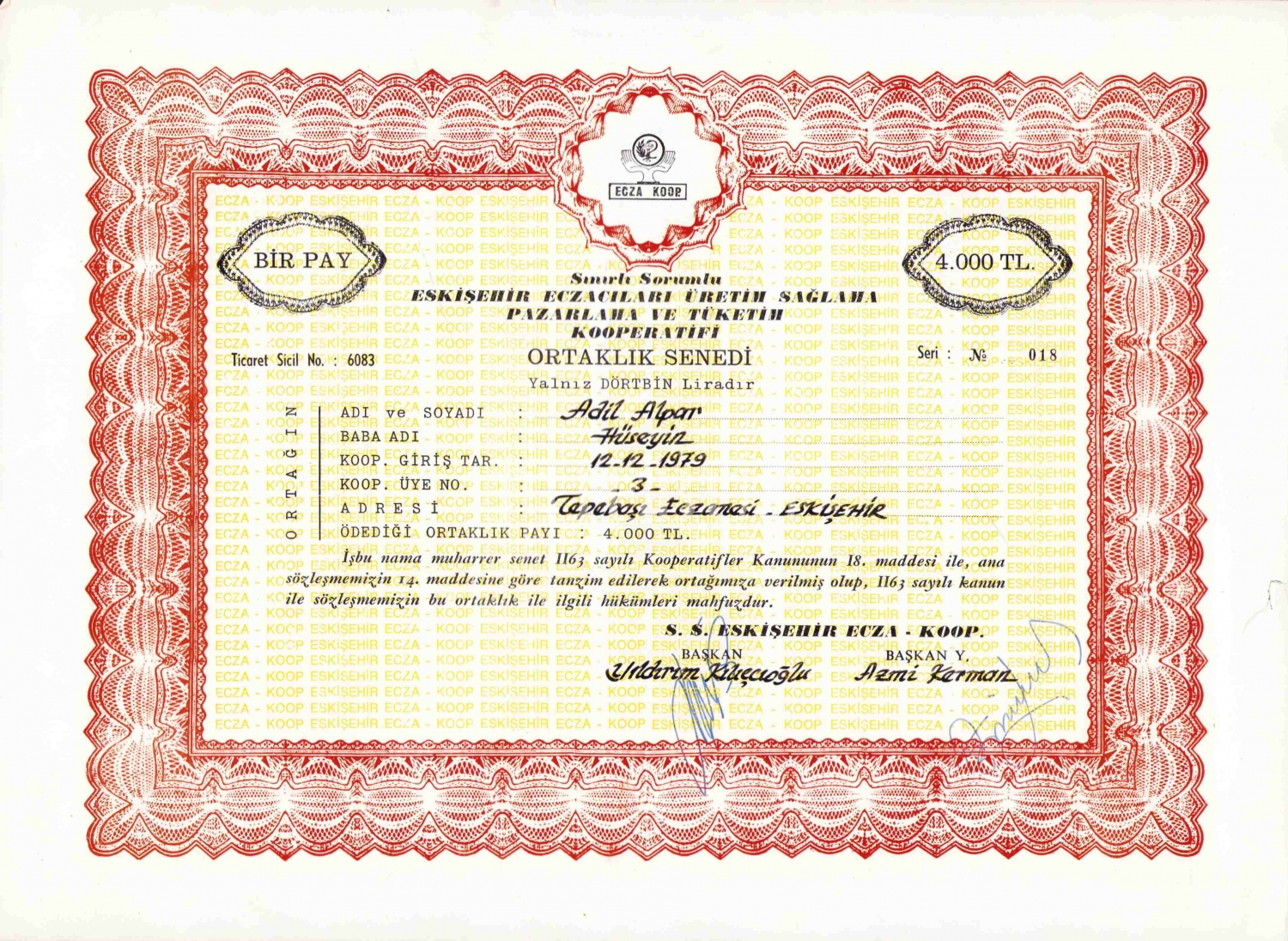 Eskişehir Eczacıları Üretim Sağlama Pazarlama ve Tüketim Kooperatifi ortaklık senedi, 1979, bir kenar yırtık, 31x23 cm