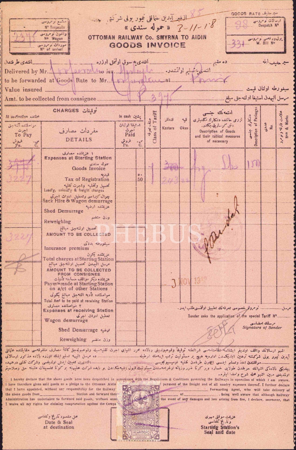 Osmanlıca - İngilizce İzmir Aydın Osmanlı Demiryolu Şirketi senet, 1918, 18x28 cm
