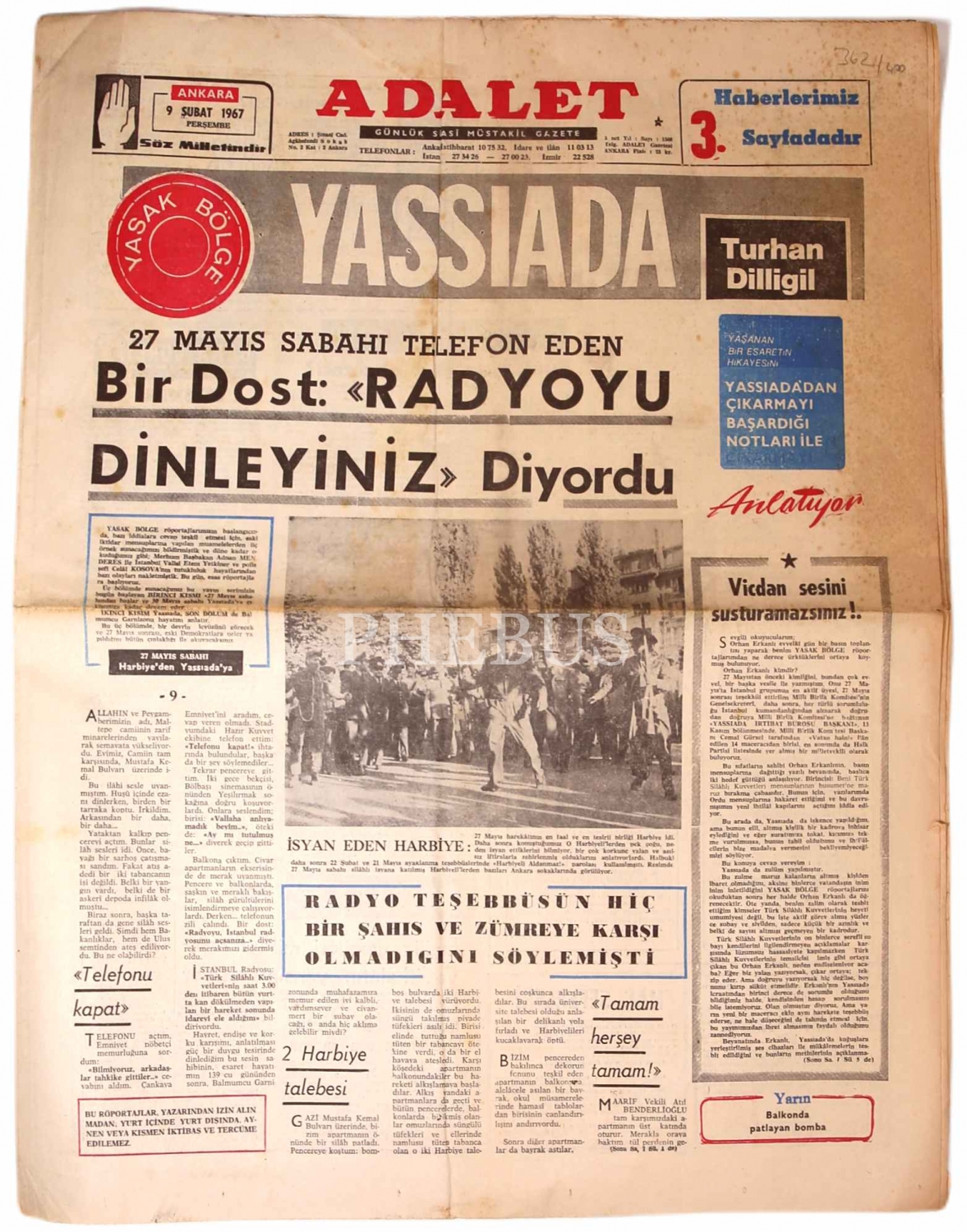 Yassıada 27 Mayıs Sabahı Telefon Eden Bir Dost: Radyoyu Dinleyiniz" Diyordu manşetli, Adalet gazetesi, 9 Şubat 1967, 8 sayfa, 42x60cm