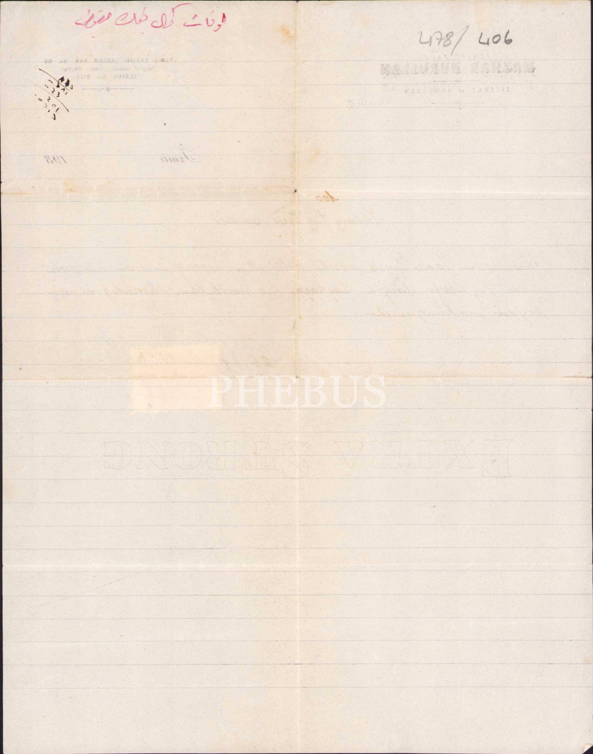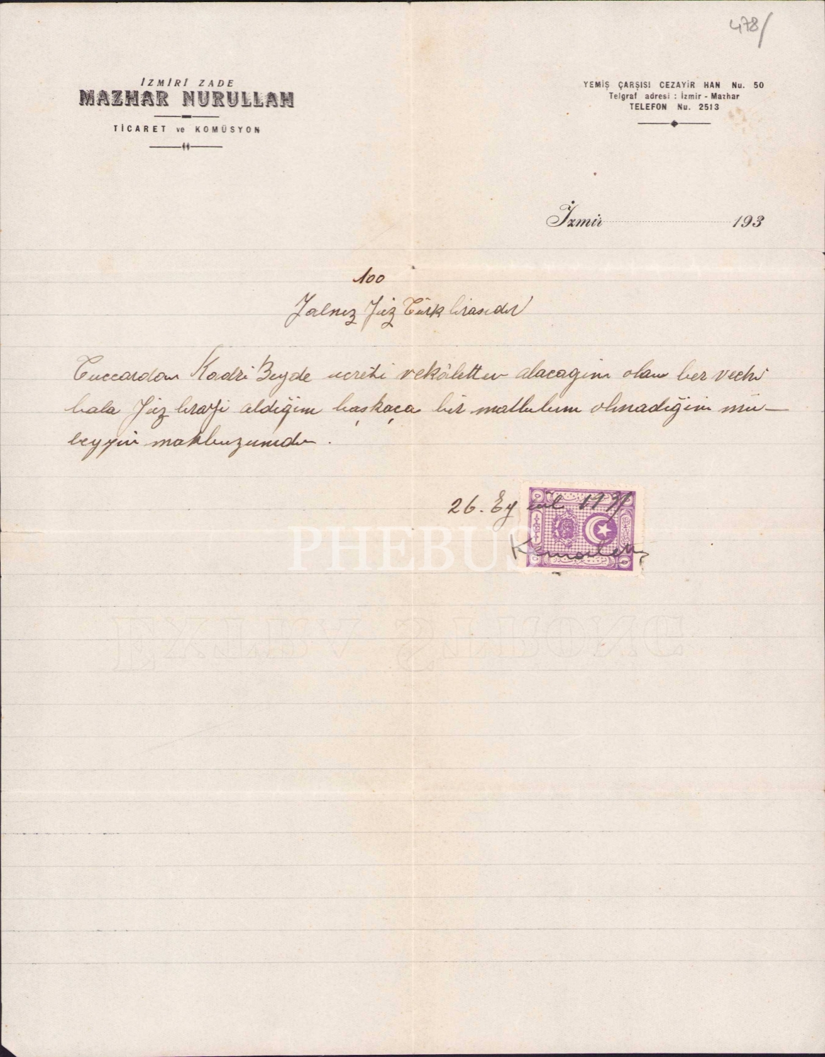 İzmiri Zade Mazhar Nurullah Ticaret ve Komüsyon antetli doküman, 22x29 cm