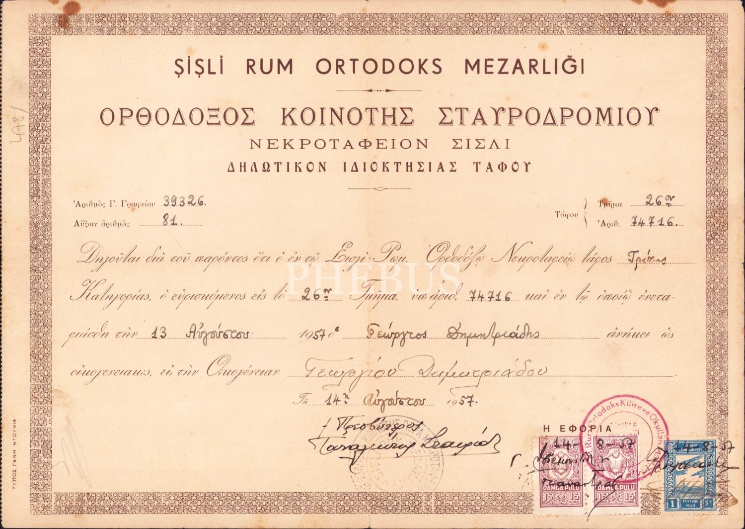 Şişli Rum Ortodoks Mezarlığı Rumca diploma, 1957, 30x21 cm