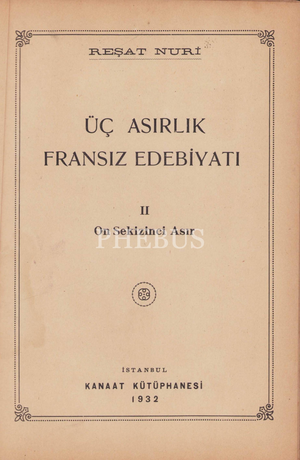 Üç Asırlık Fransız Edebiyatı - 18 inci Asır, Reşat Nuri, İstanbul - Kanaat Kütüphanesi 1932, 55 sayfa, 16x24 cm