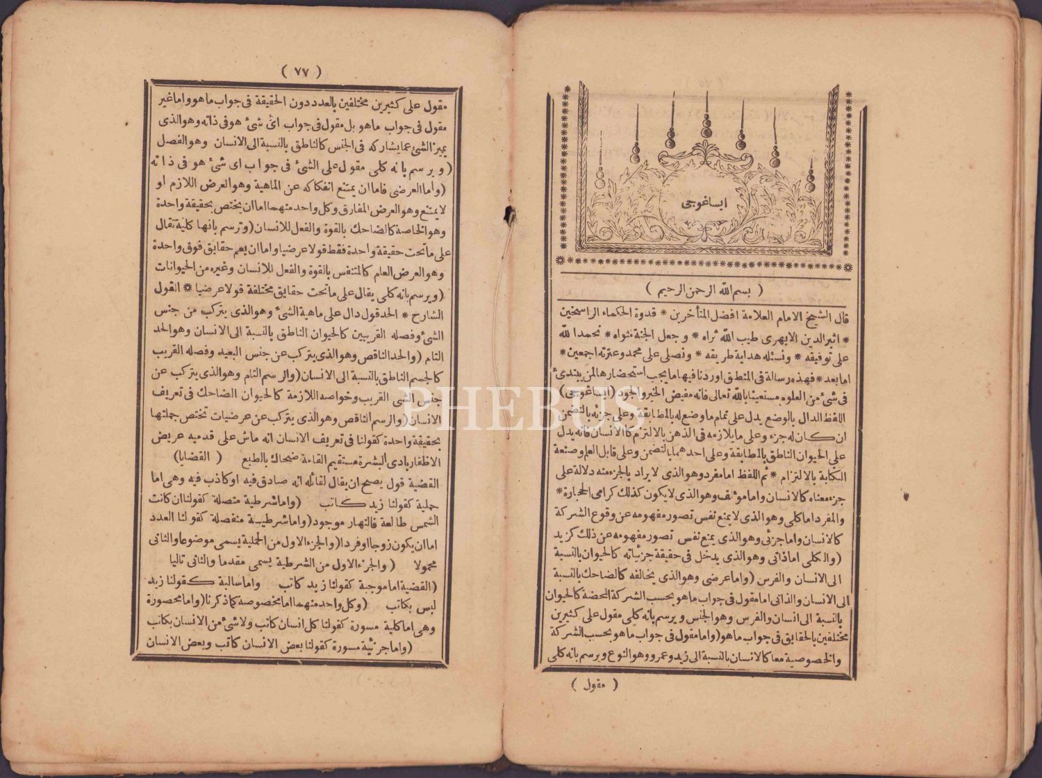 1286, Arapça, 80 sayfa, sayfalar ters basılmıştır. 15x23 cm, Furfuriyus (Porphyrios) tarafından Aristo'nun Kategorilerine giriş olarak yazılan eser; İslam dünyasında aynı maksatla yazılmış eserlerin ortak adı.