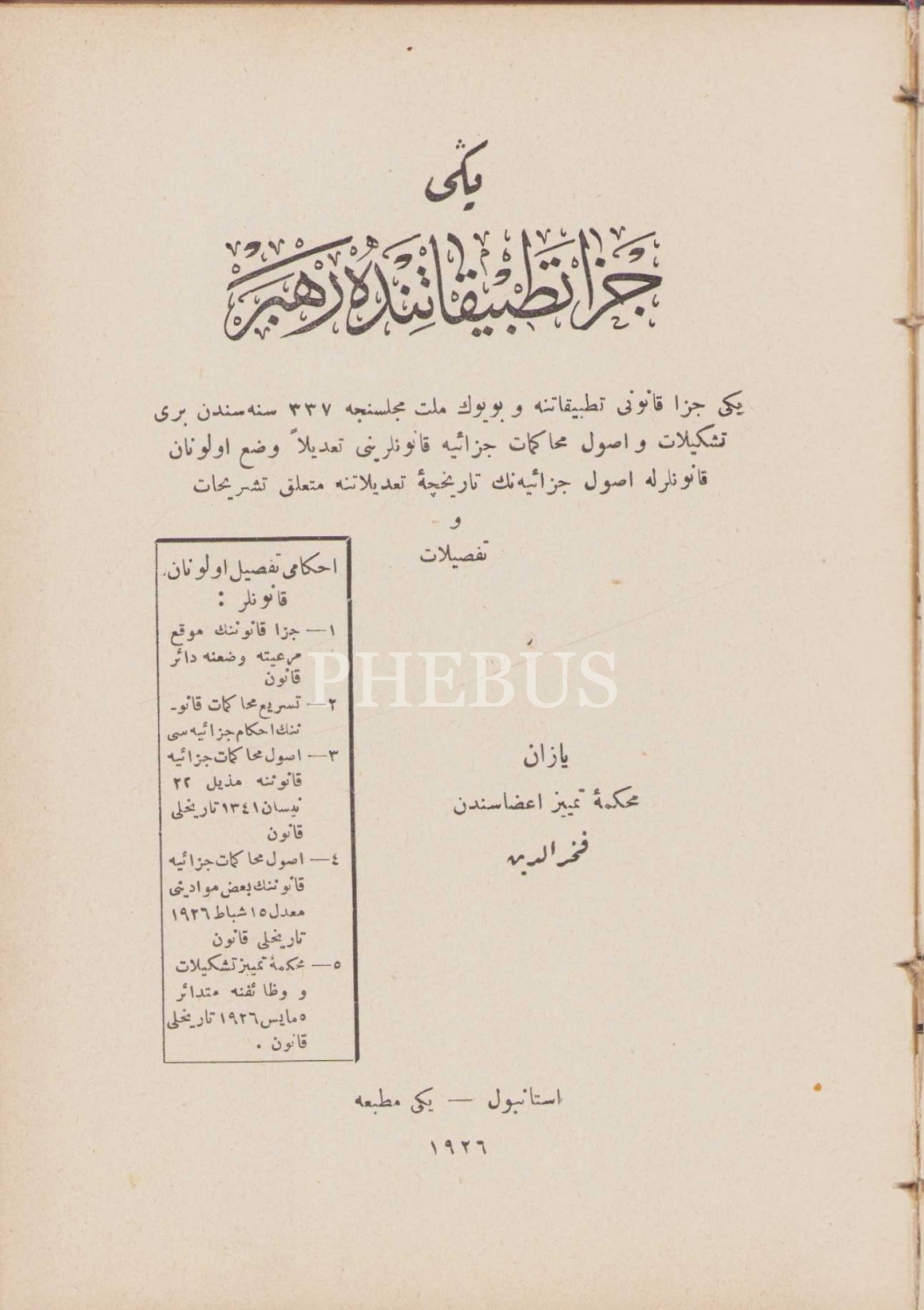 Osmanlıca Yeni Ceza Tatbikatında Rehber, Fahreddin, Yeni Matbaa , İstanbul, 1926, 359 sayfa, 13x19 cm, ÖZEGE; 22993