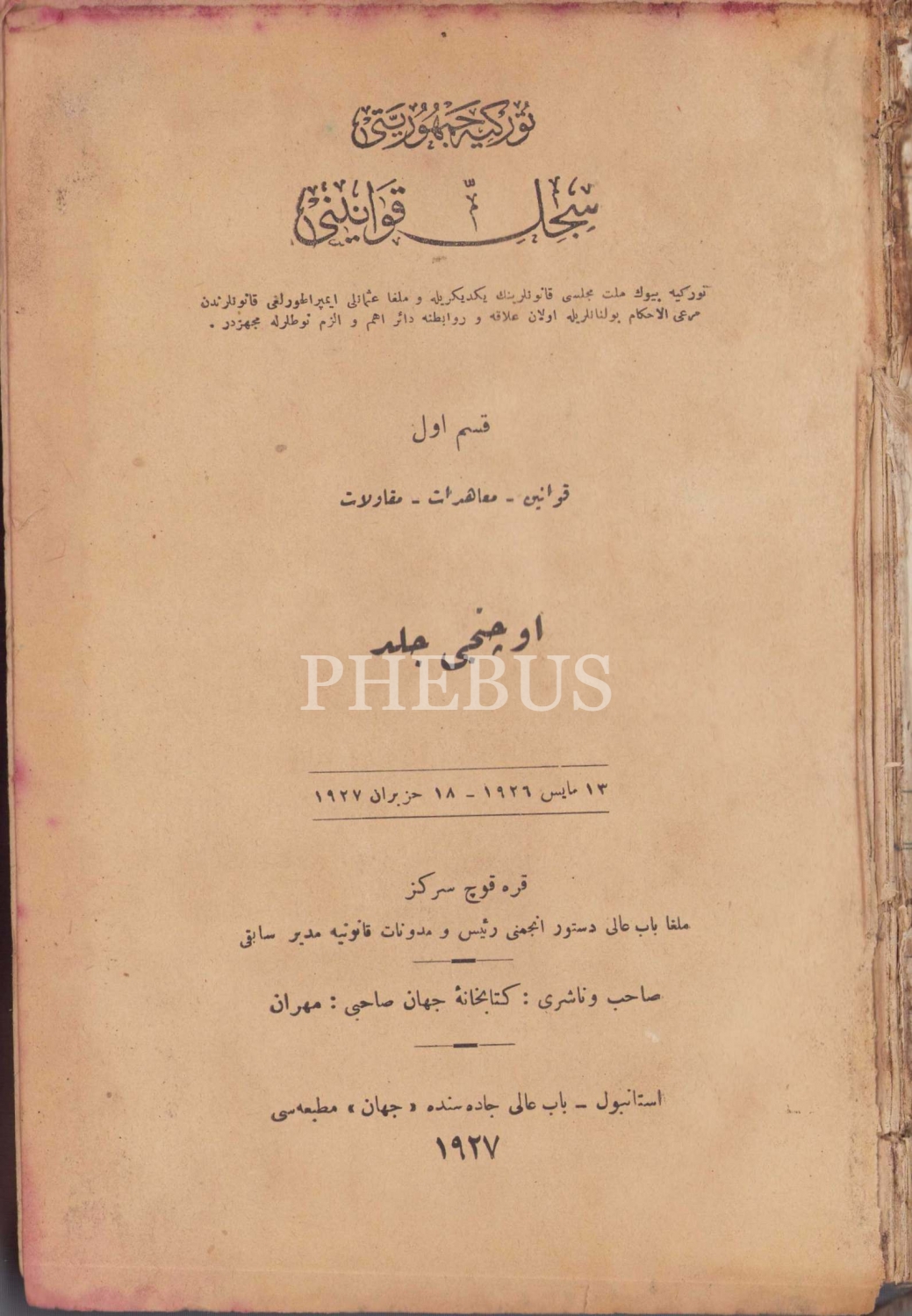 Osmanlıca Türkiye Cumhuriyeti Sicill-i Kavanini - 3. cilt, Çev. Sarkis Karakoç, Cihan Matbaası, İstanbul, 1927, haliyle, 926 sayfa, 16x25 cm, ÖZEGE; 21773