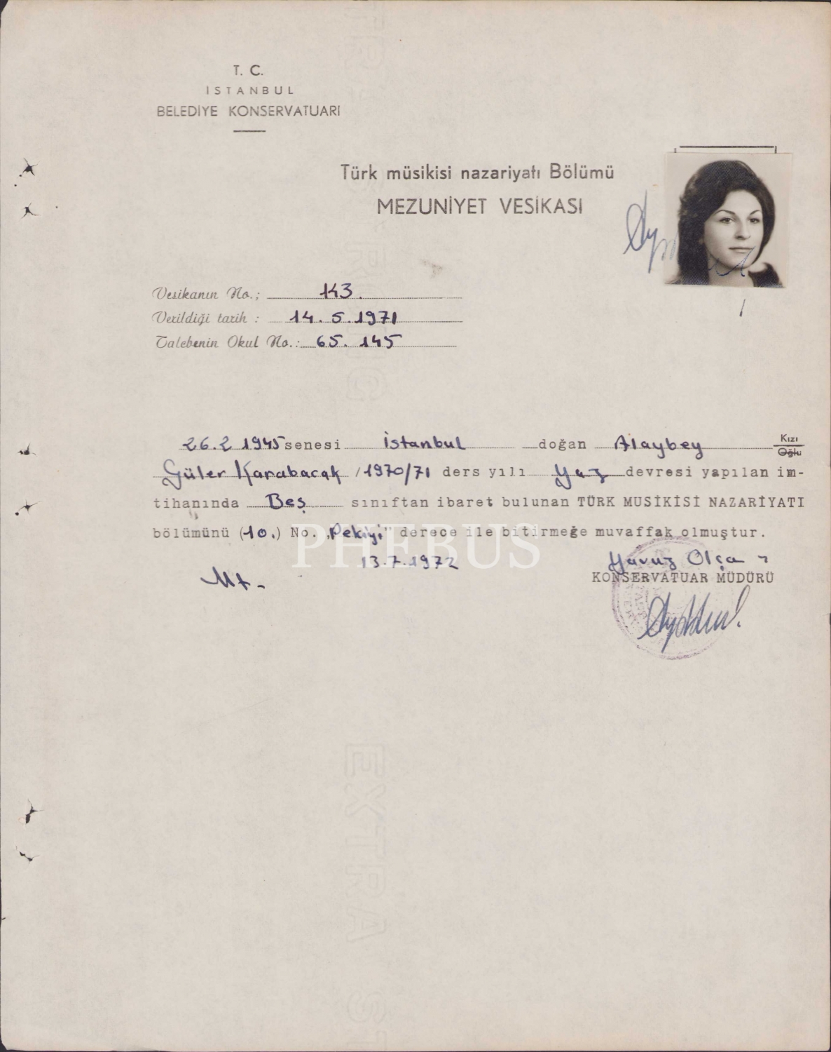 İstanbul Belediye Konservatuarı Türk Musikisi Nazariyatı Bölümü Mezuniyet Vesikası, 1971, 23x29 cm