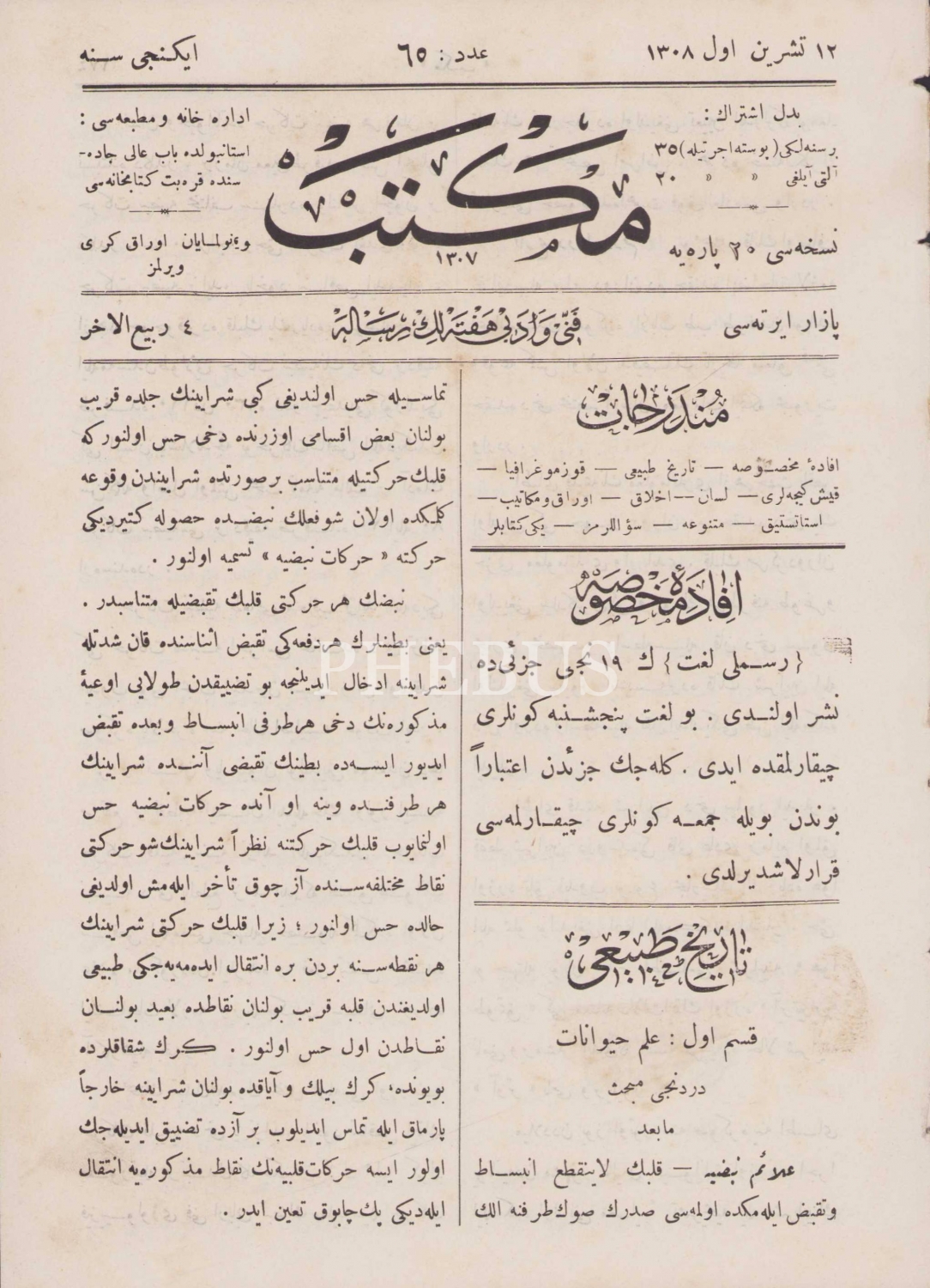 Osmanlıca Mektep risalesi, 12 Teşrin-i evvel 1308, 15 sayfa, 17x24 cm