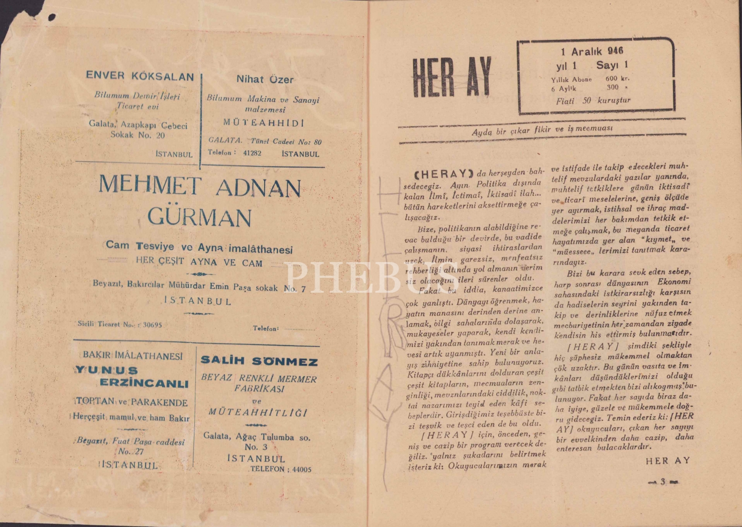 Her Ay Fikir ve İş Mecmuası, 1 Aralık 1946, Yıl 1, Sayı 1, 34 sayfa, 18x24 cm
