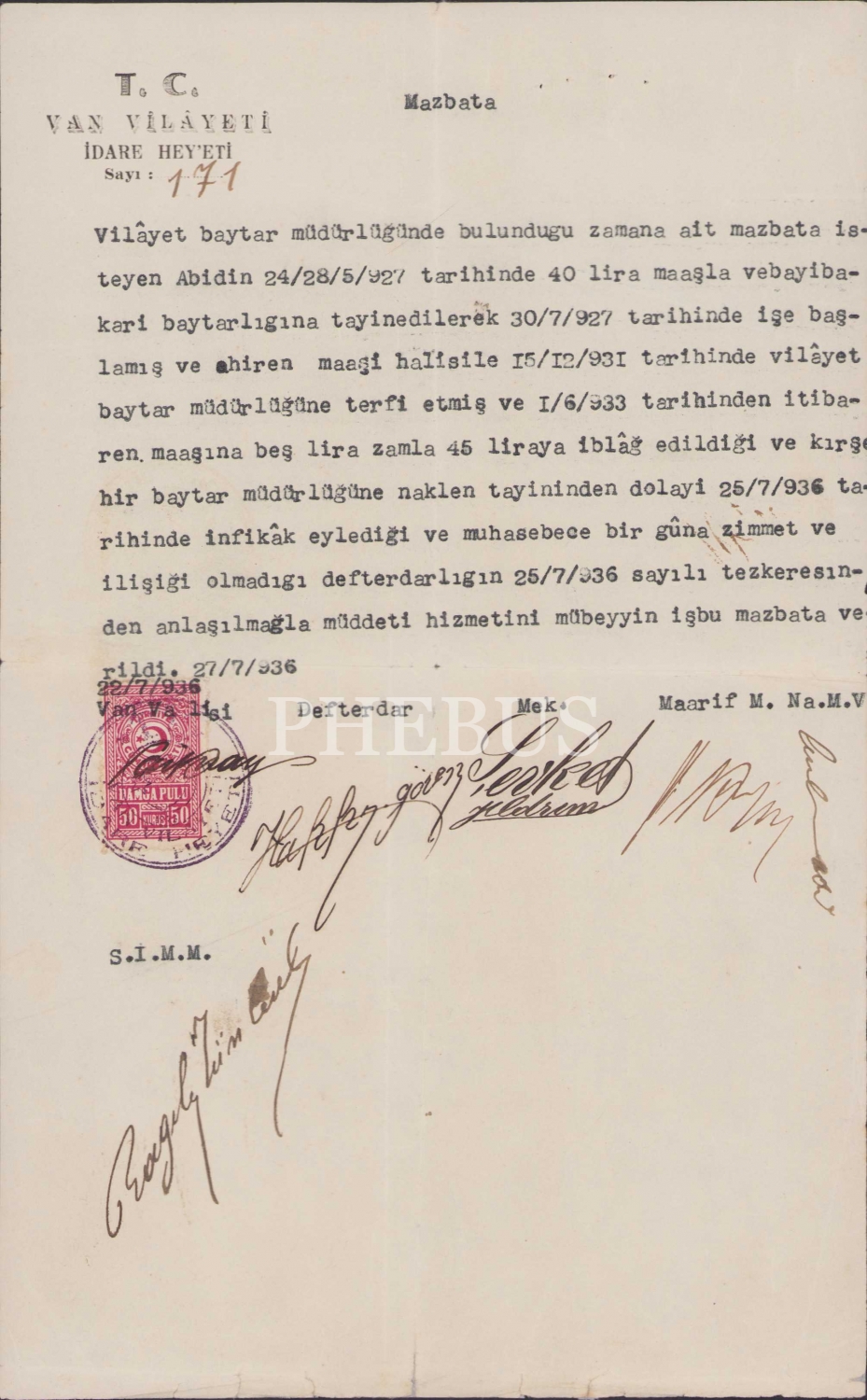 T.C. Van Vilayeti İdare Heyeti antetli 1936 tarihli mazbata, 16x26 cm