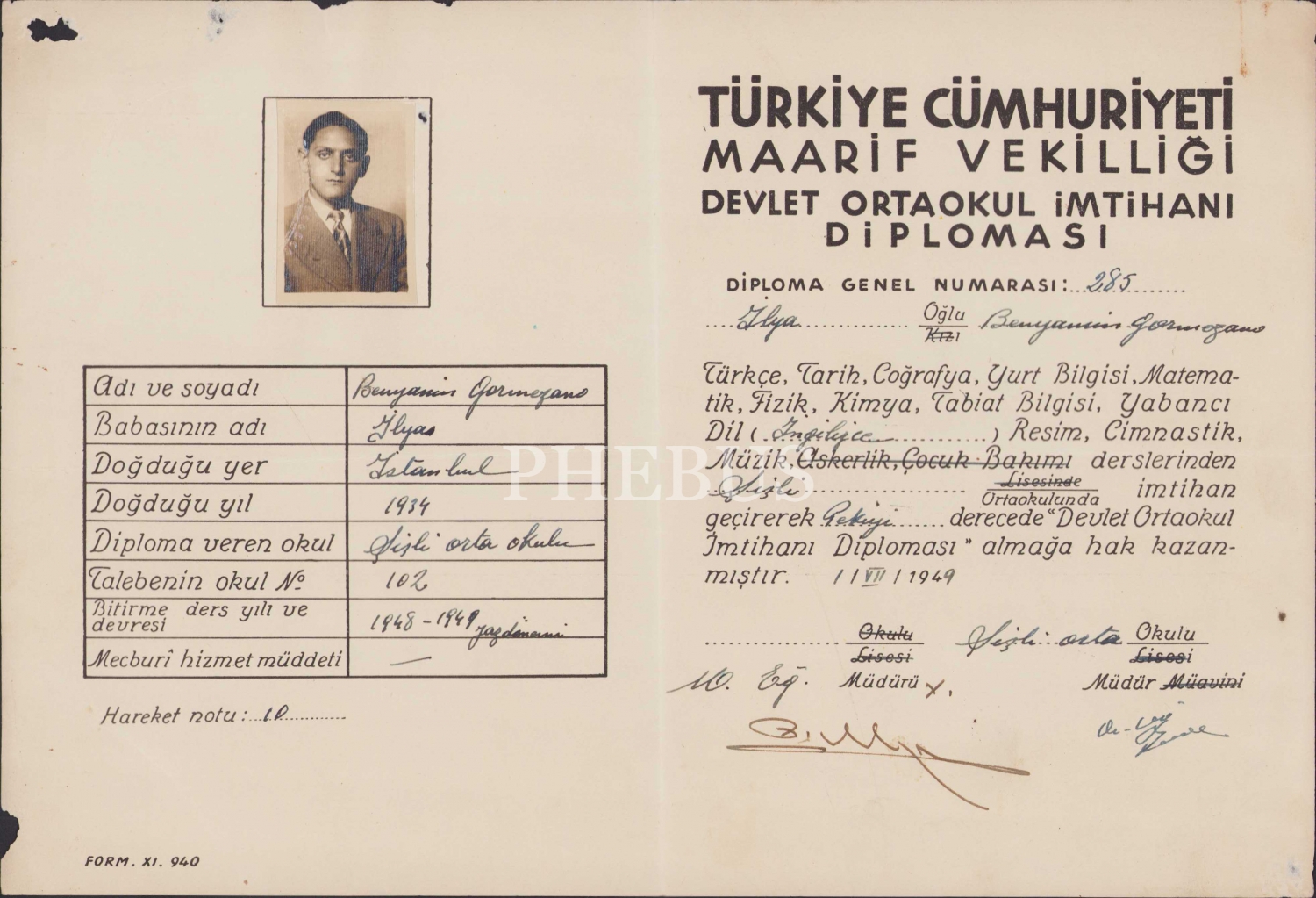 Şişli Orta Okulu diploma, 1949, 31x22 cm