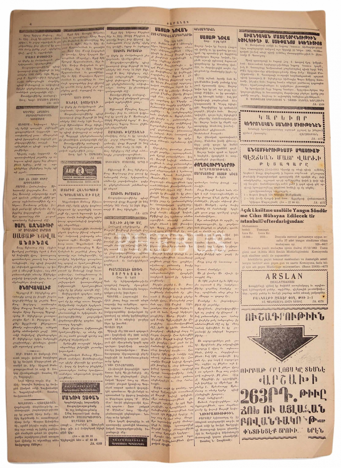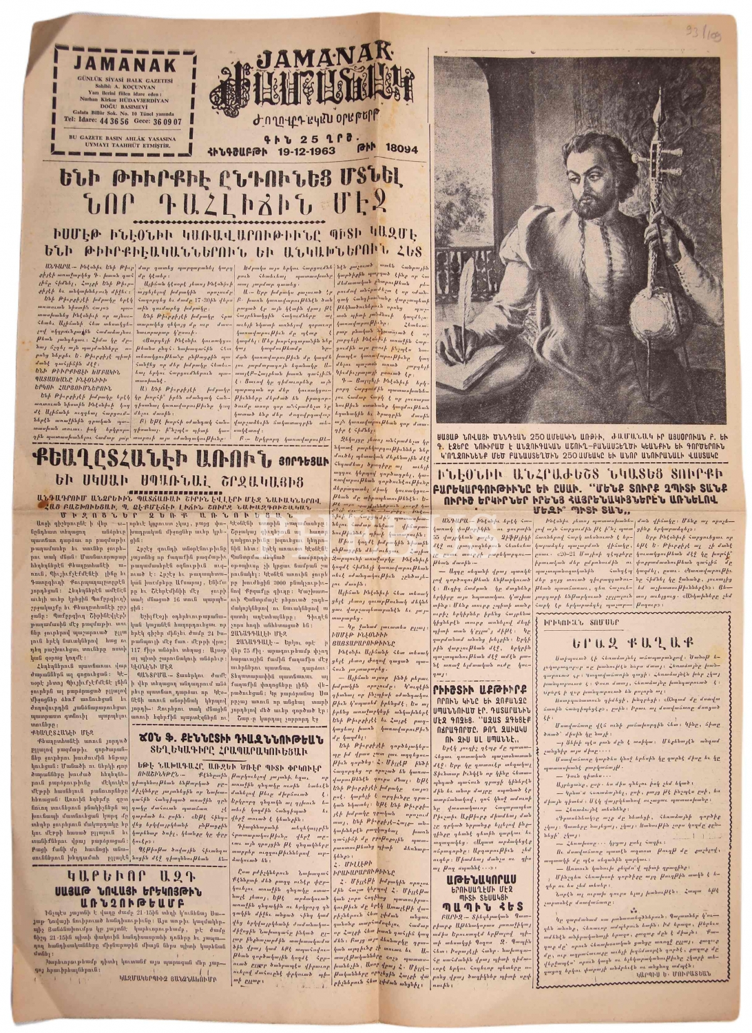 Jamanak - Ermenice günlük siyasi halk gazetesi, 19.12.1963, 4 sayfa, 40x60 cm