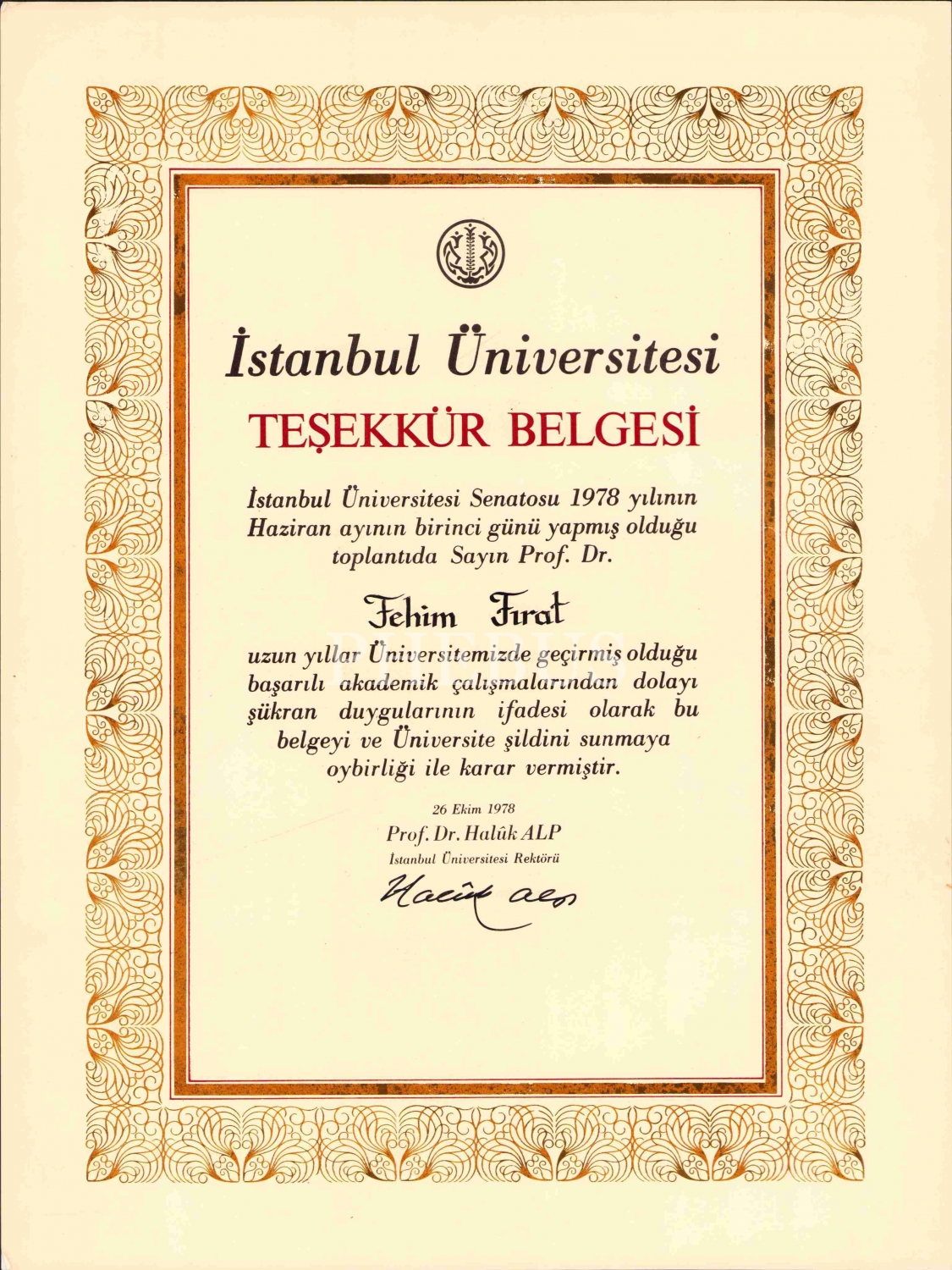 İstanbul Üniversitesi Teşekkür Belgesi, 1978, 28x38 cm