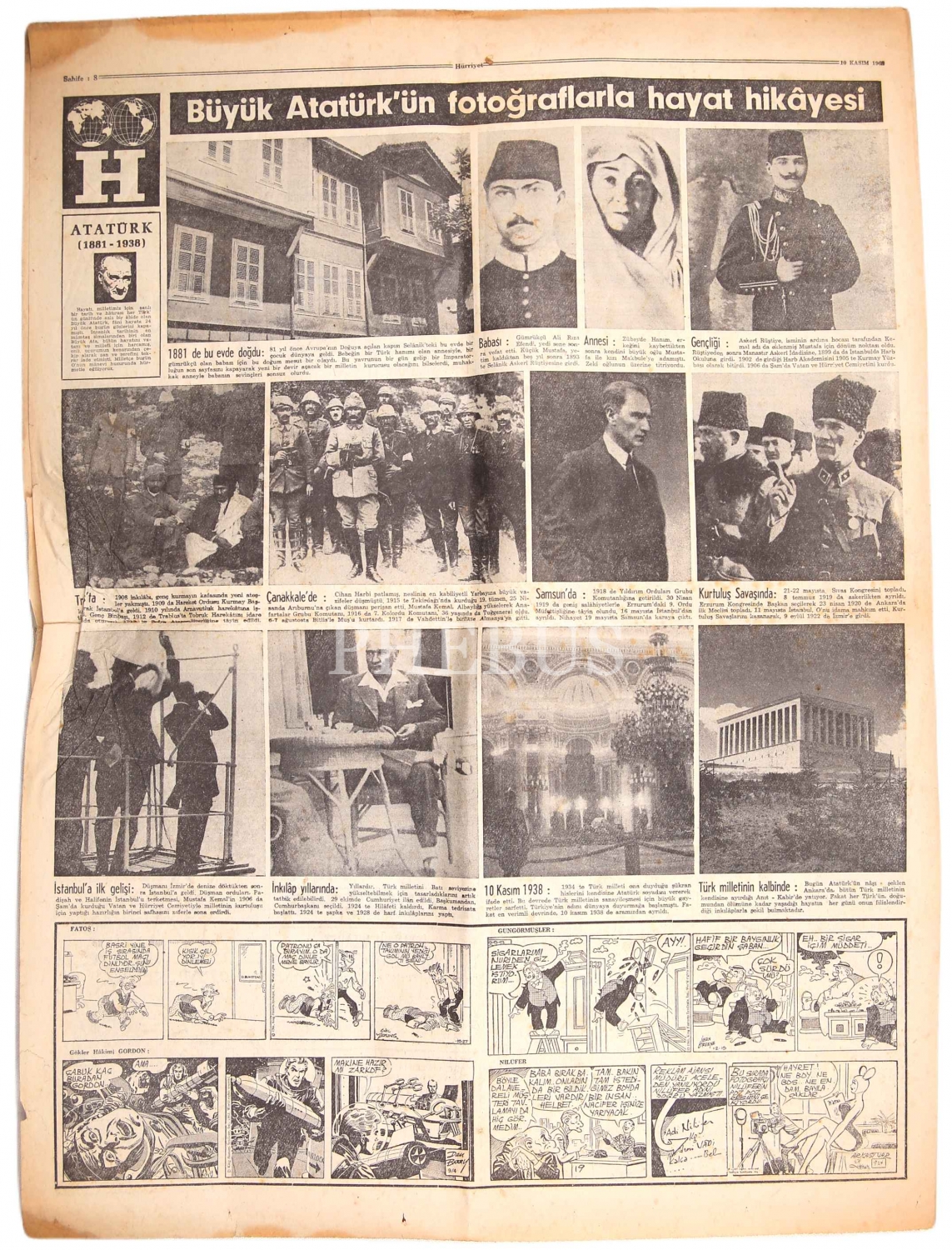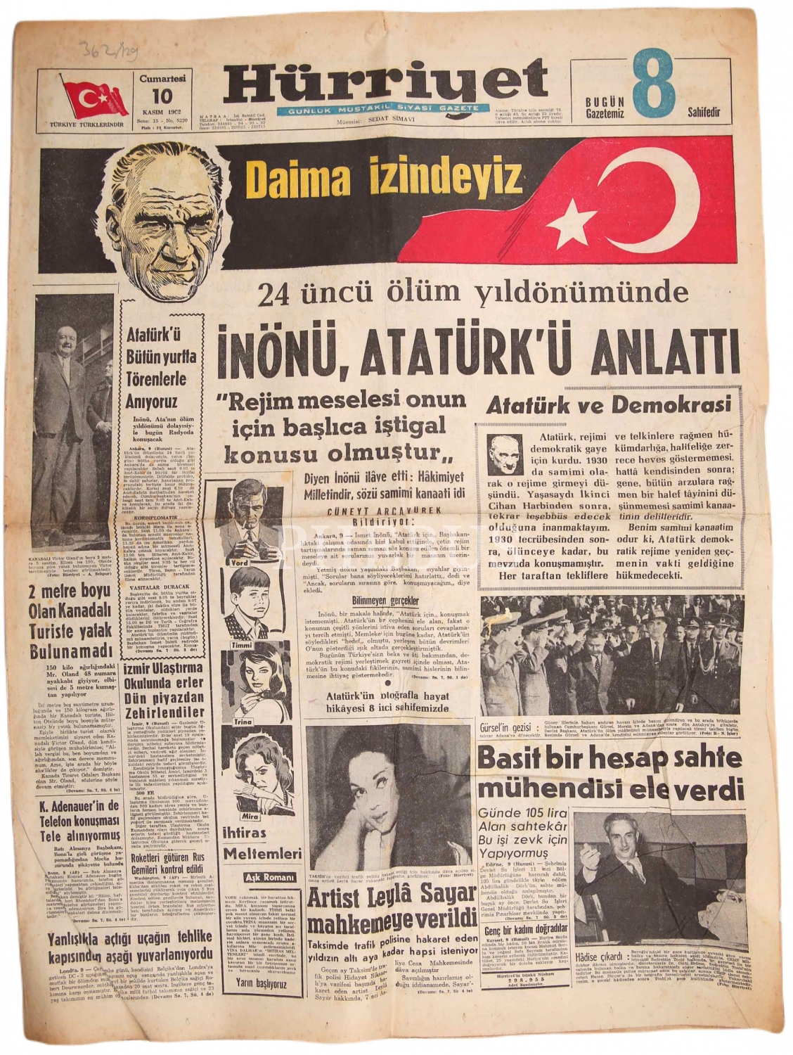 24 üncü Ölüm Yıldönümünde İnönü, Atatürk'ü Anlattı manşetli, Hürriyet gazetesi, 10 Kasım 1962, 4 sayfası eksik, 4 sayfa, 29x42 cm