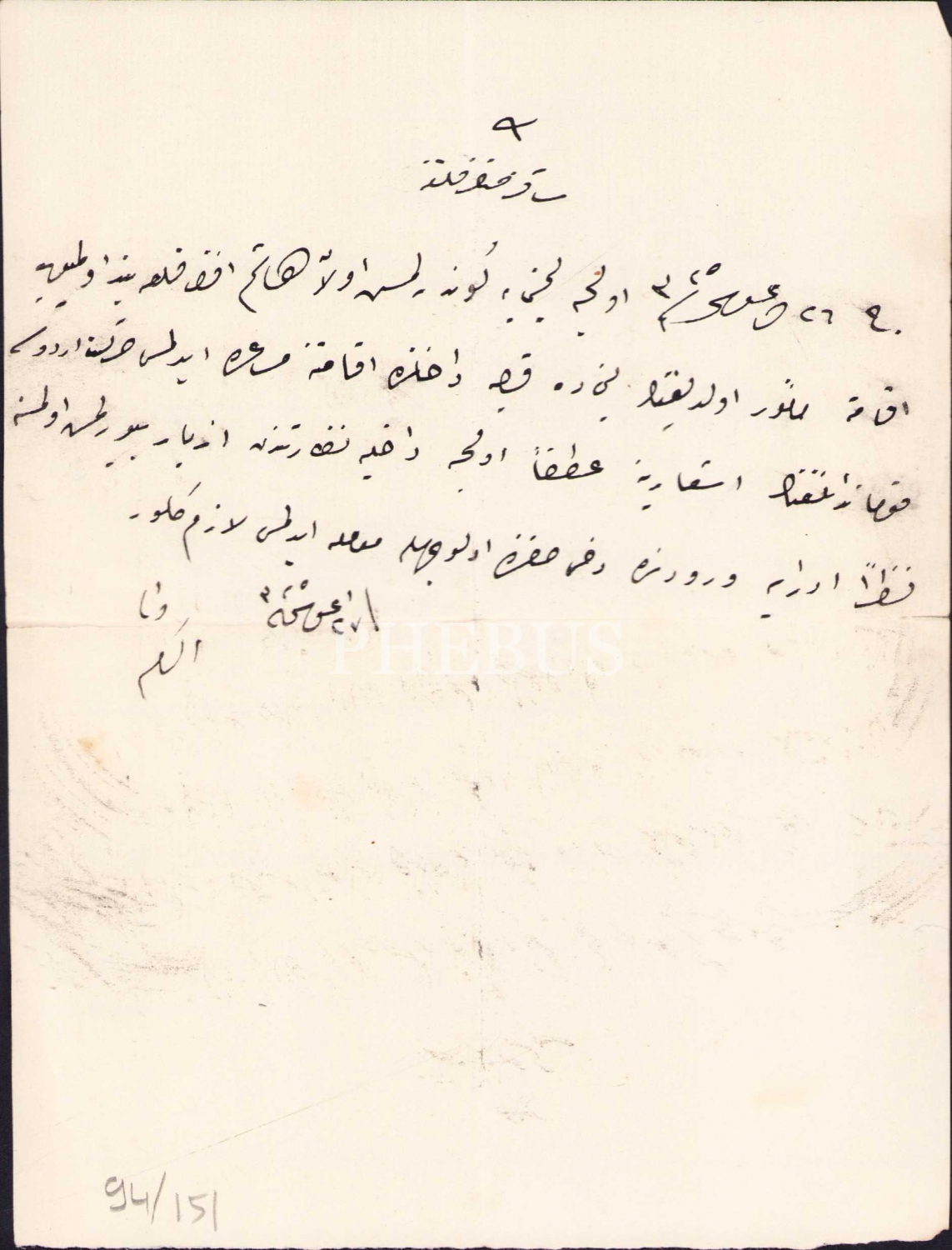 1325 yılında harekat ordusunun emri üzerine Haşim Efendi'nin sakıza kalabend [tutuklu] gönderilmesine dair Osmanlıca evrak, 15x20 cm