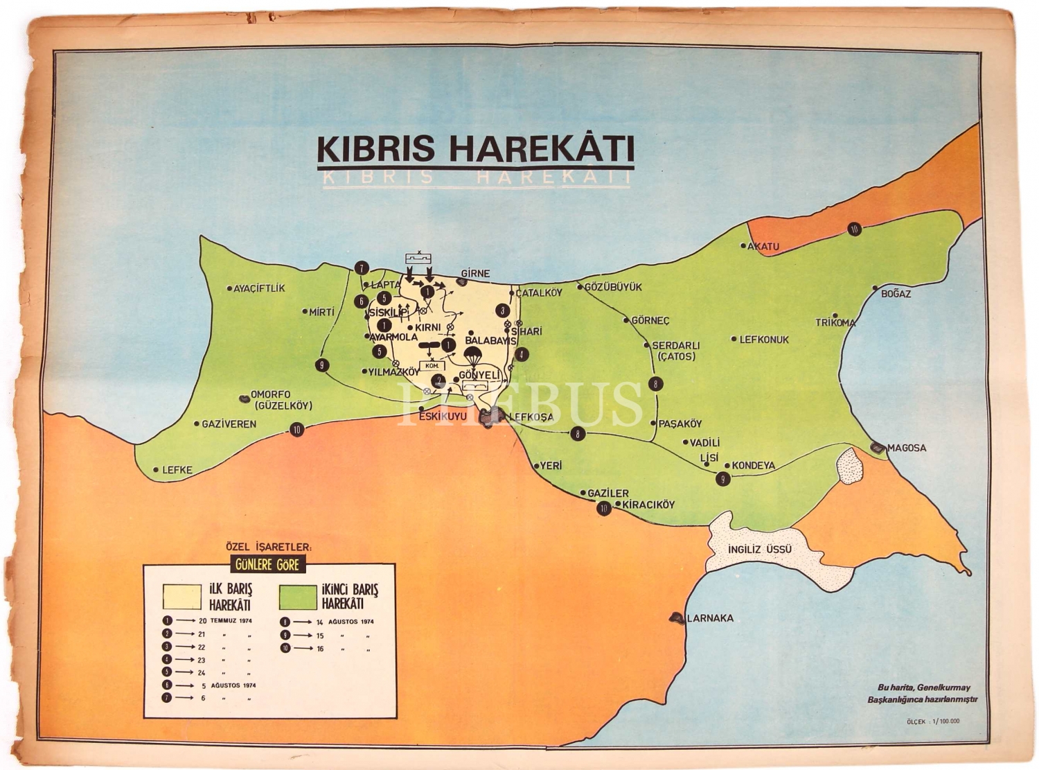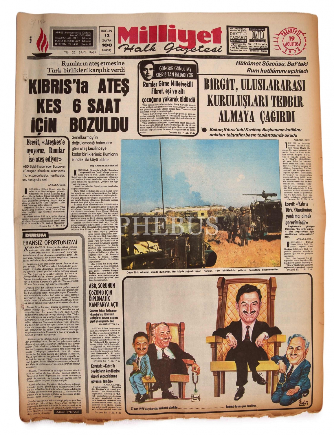 Kıbrıs'ta Ateşkes 6 Saat İçin Bozuldu manşetli, Milliyet gazetesi, 19 Ağustos 1974, arkası Kıbrıs Harekatı harialı, 10 sayfa, 42x60 cm