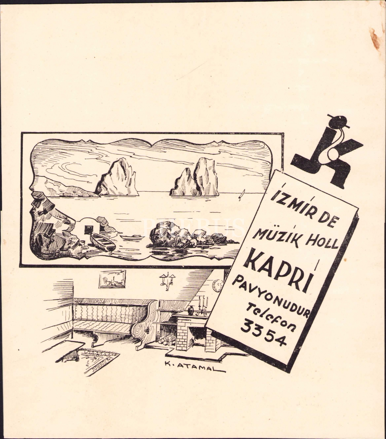 K. Atamal çizim İzmir'de Müzik Holl Kapri Pavyonudur, 19x21 cm