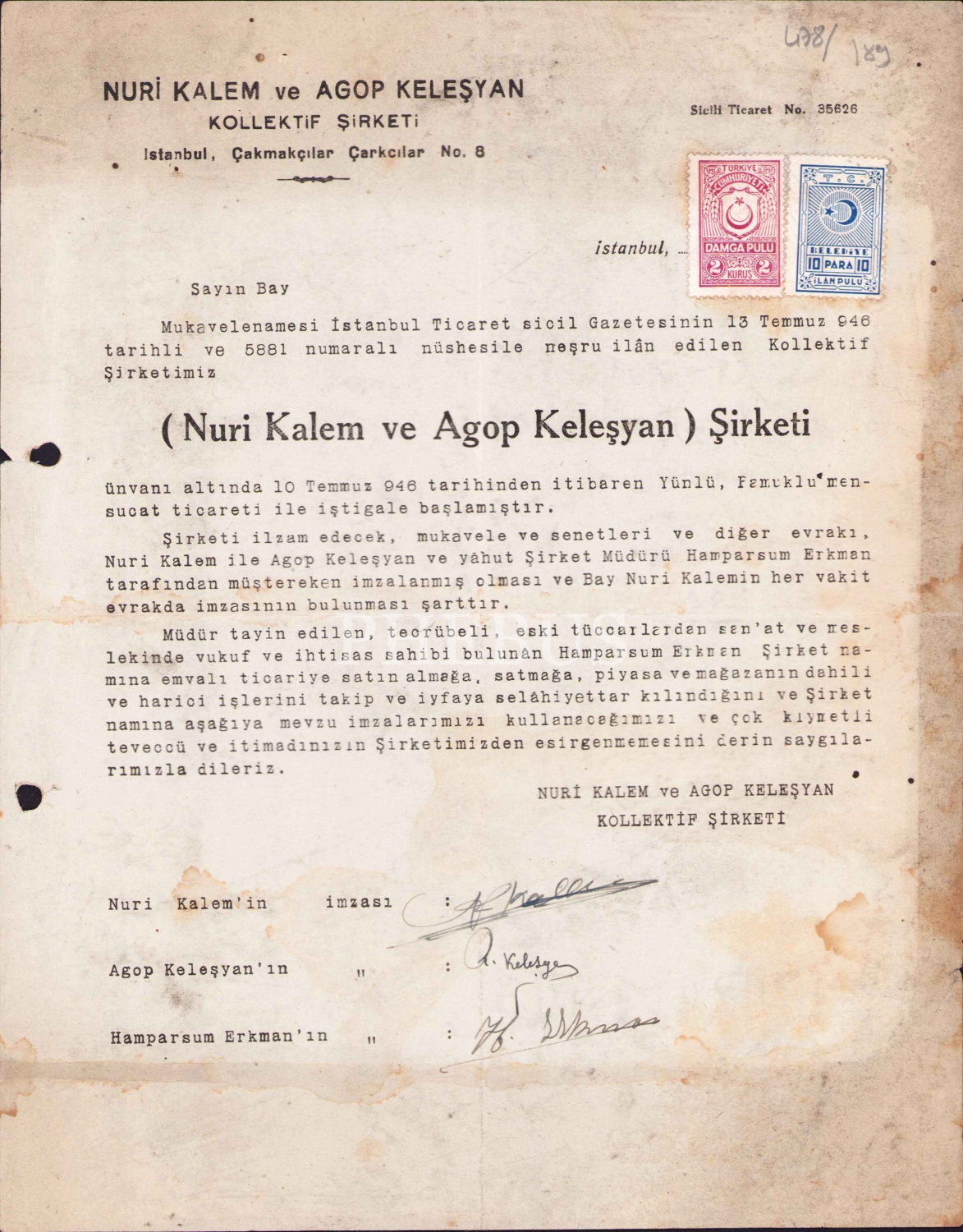 Nuri Kalem ve Agop Keleşyan Kollektif Şirketi - İstanbul antetli doküman, ıslak imzalı, haliyle, 22x28 cm