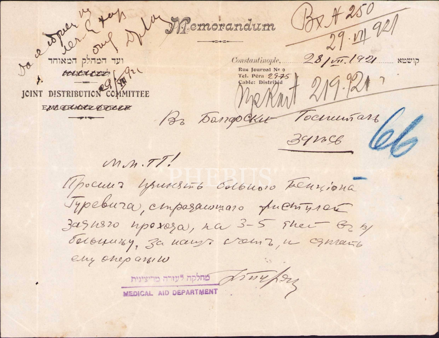 İbranice - Fransızca antetli 1921 tarihli doküman, Ermenice - İngilizce Medical Aid Department damgalı, 20x16 cm
