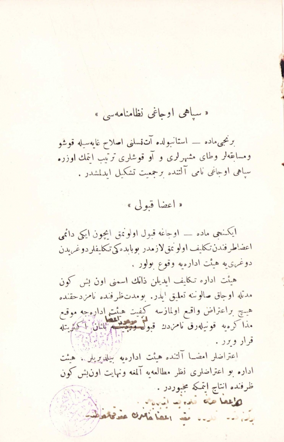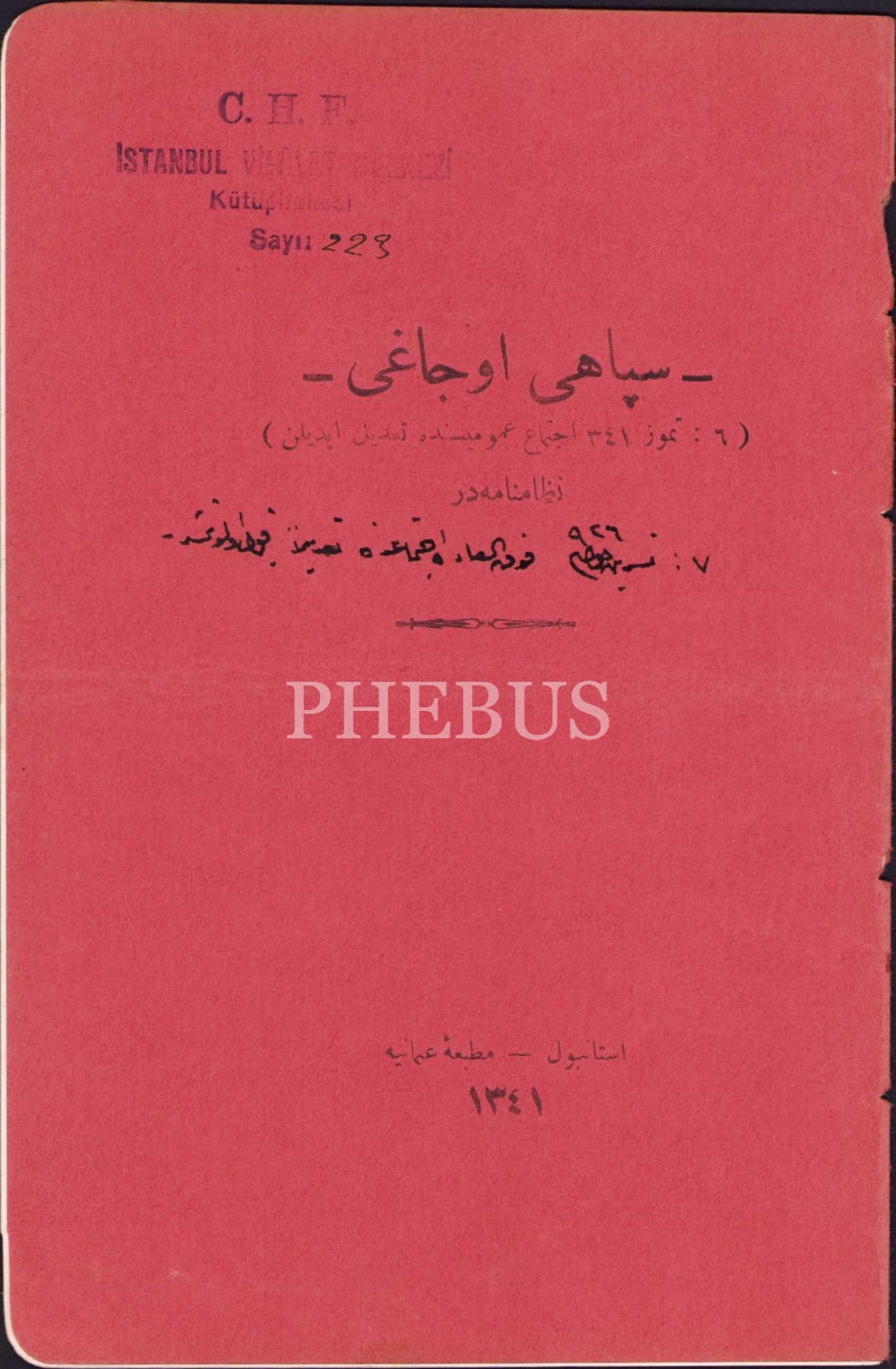 Osmanlıca Sipahi Ocağı [6 Temmuz 341 İctima Umumiyesinde Ta'dil Edilen Nizamnamedir], Matbaa-i Osmani, İstanbul, 1341, 10 sayfa, 12x19 cm