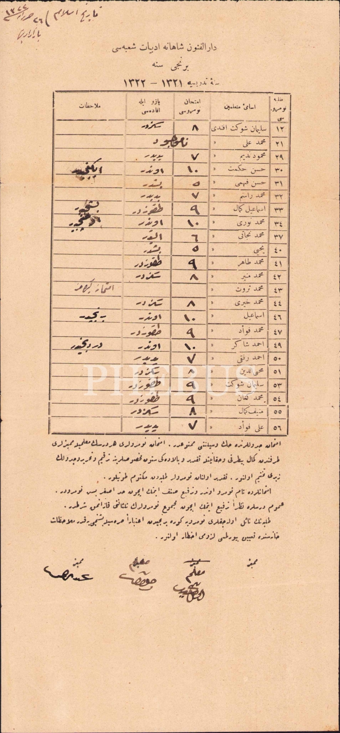 Osmanlı Darülfünun Şahane Edebiyat şubesi birinci seneye ait 1322 - 1321 ders yılı talebe listesi, 17x38 cm