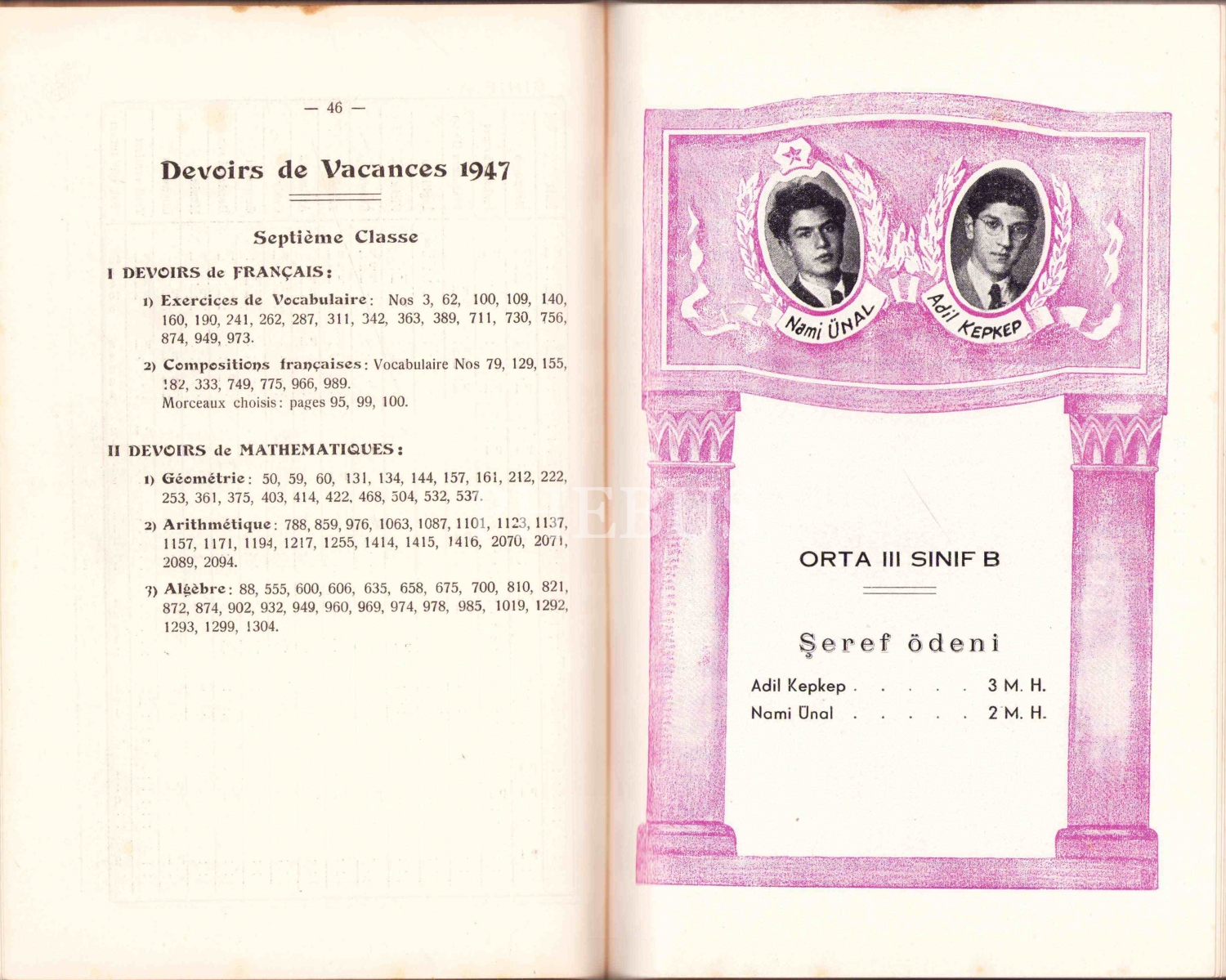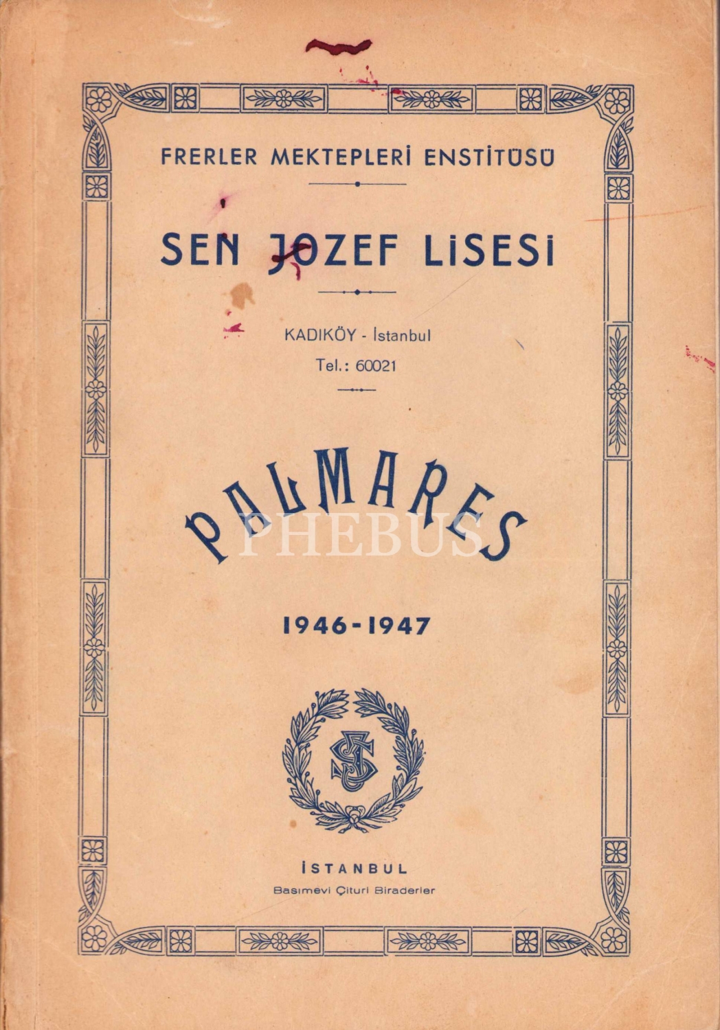 Frerler Mektepleri Enstitüsü Sen Jozef Lisesi Palmares 1946 - 47, Çituri Biraderler Basımevi, İstanbul, sırt bir kenar haliyle, 80 sayfa, 16x23 cm