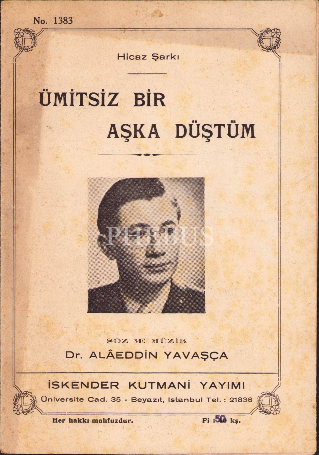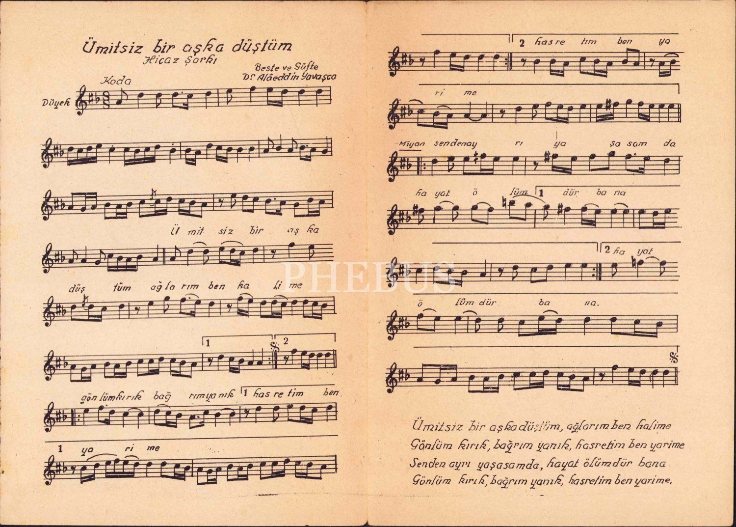 Müzik, nota, Ümitsiz Bir Aşka Düştüm, söz ve müzik Alaeddin Yavaşça, İskender Kutmani Yayımı, 4 sayfa, 13x19 cm