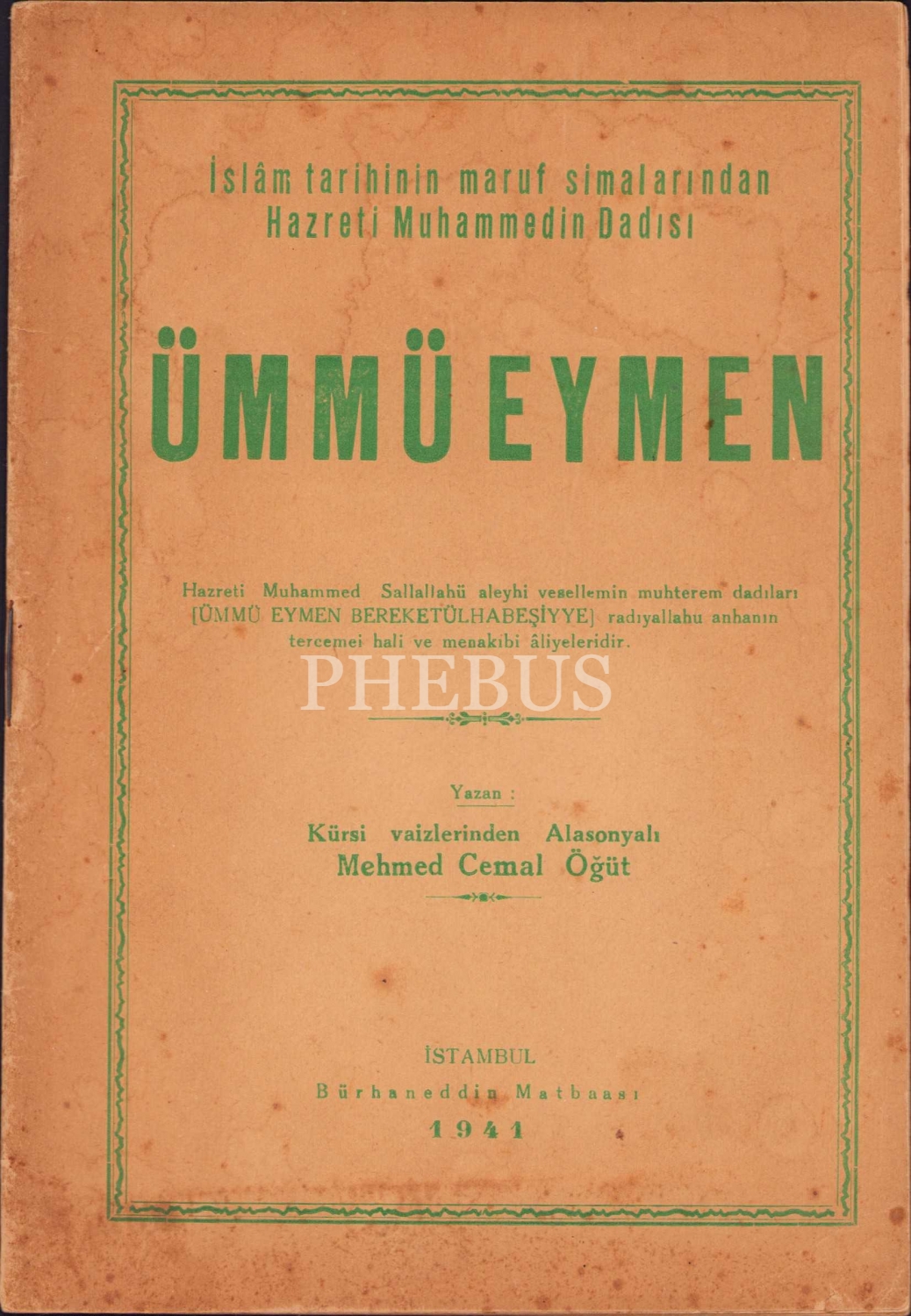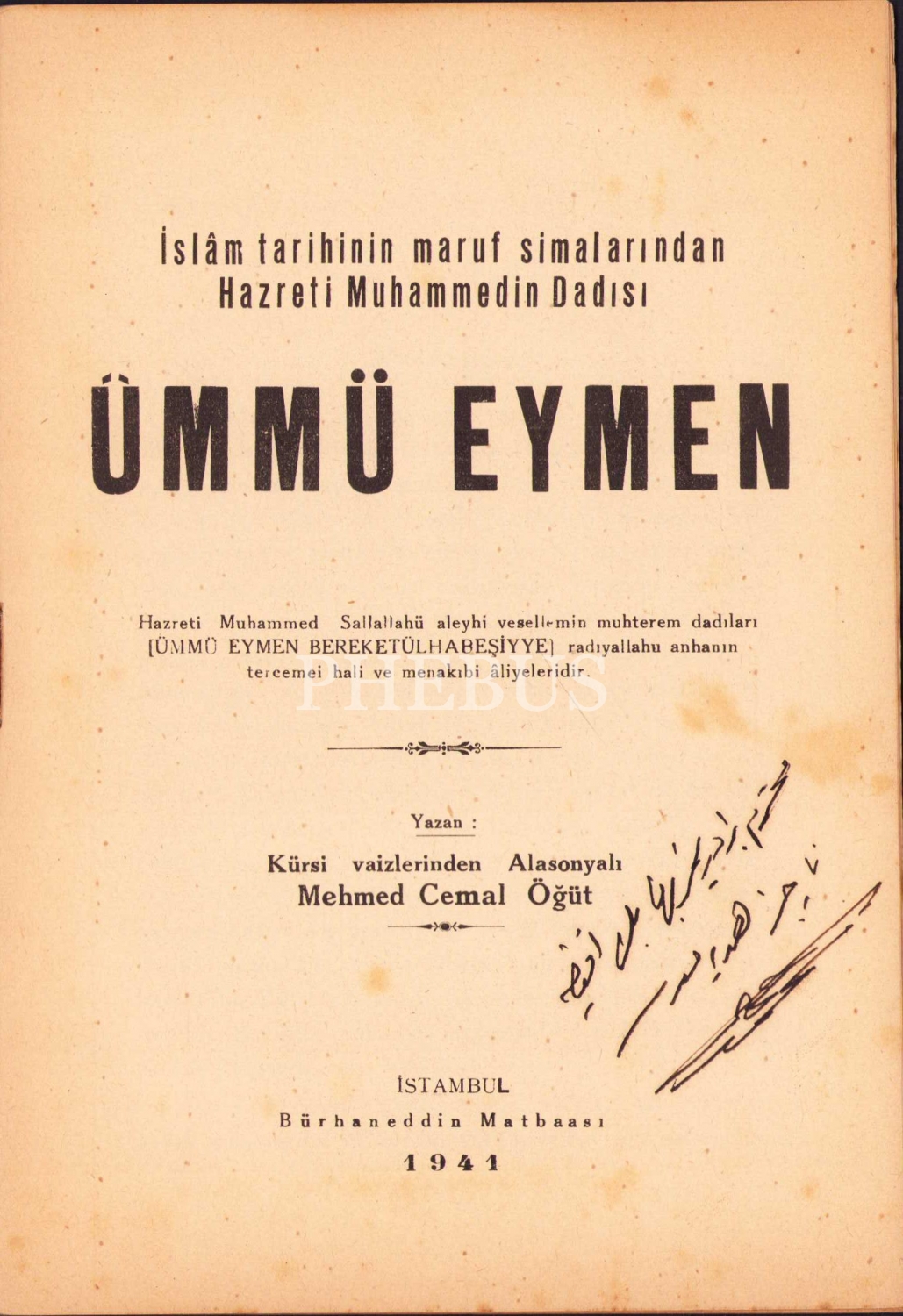 İslam Tarihinin Maruf Simalarından Hazreti Muhammedin Dadısı Ümmieymen , Yazan: Kürsi Vaizlerlerinden Alasonyalı Mehmed Cemal Öğüt, Yazarından imzalı ithaflı, İstambul Burhaneddin Matbaası 1941, 31 sayfa, 14x20 cm